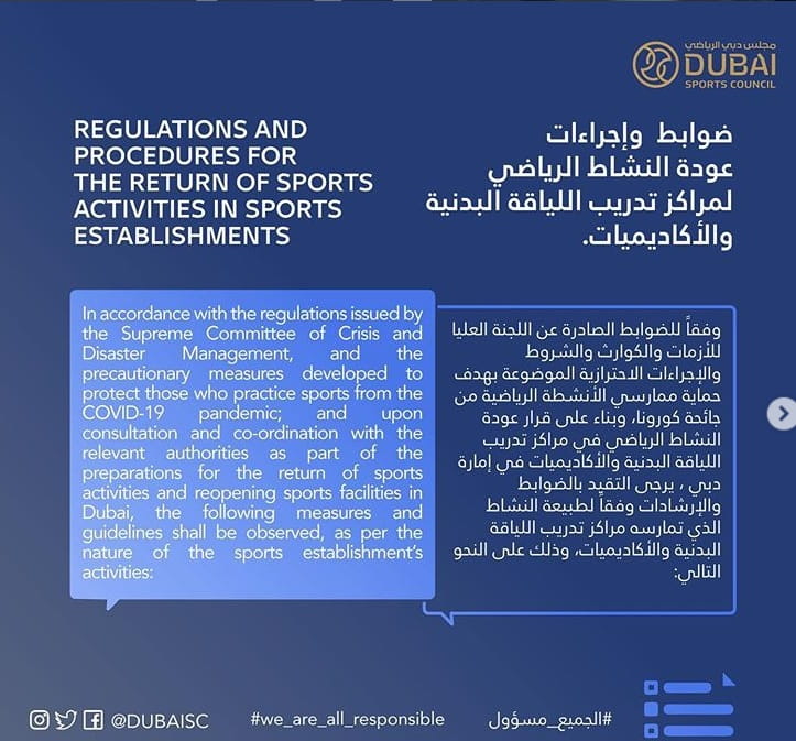 In implementation of the decision of His Highness Sheikh Hamdan bin Mohammed bin Rashid Al Maktoum, Crown Prince of Dubai and Chairman of the Executive Council, regarding the resumption of the economic movement in Dubai for its activities on the fourth day of Eid Al-Fitr, the Dubai Sports Council issued a list of controls and procedures for the return of sports activity in fitness training centers and academies in the Emirate of Dubai.