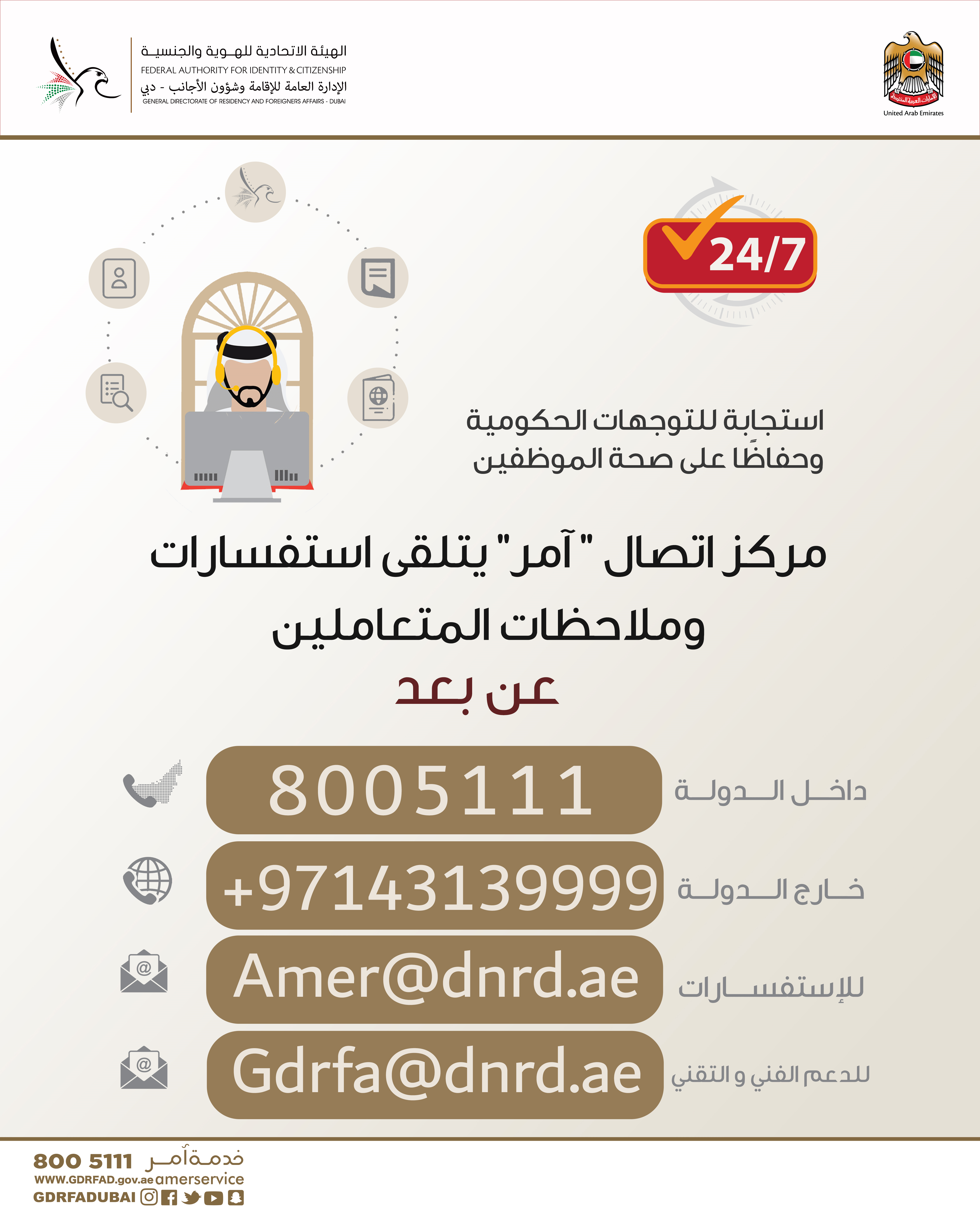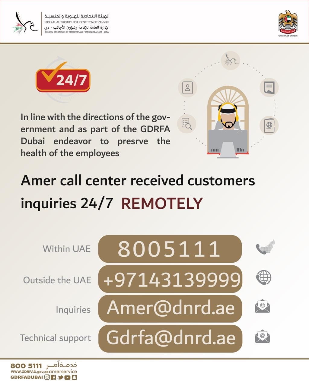 The General Directorate of Residency and Foreigners Affairs in Dubai announced the activation of the “remote work “system for "Amer" call center starting from Thursday March 26, 2020 for two weeks subject to renewal and evaluation.