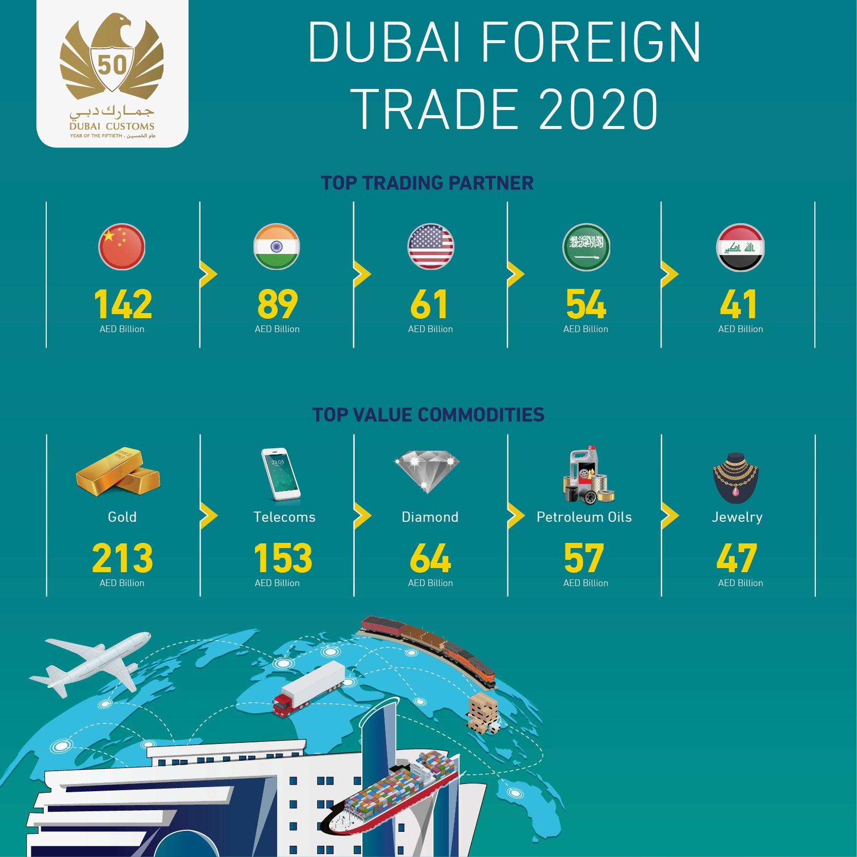 China maintained its position as Dubai’s largest trading partner in 2020 with AED142 billion worth of trade. India came in second with AED89 billion, followed by the USA in third place with AED61 billion. Saudi Arabia continued to be Dubai’s largest Gulf and Arab trade partner and its fourth largest global trade partner with AED54 billion worth of trade, followed by Iraq in the fifth place with AED41 billion.