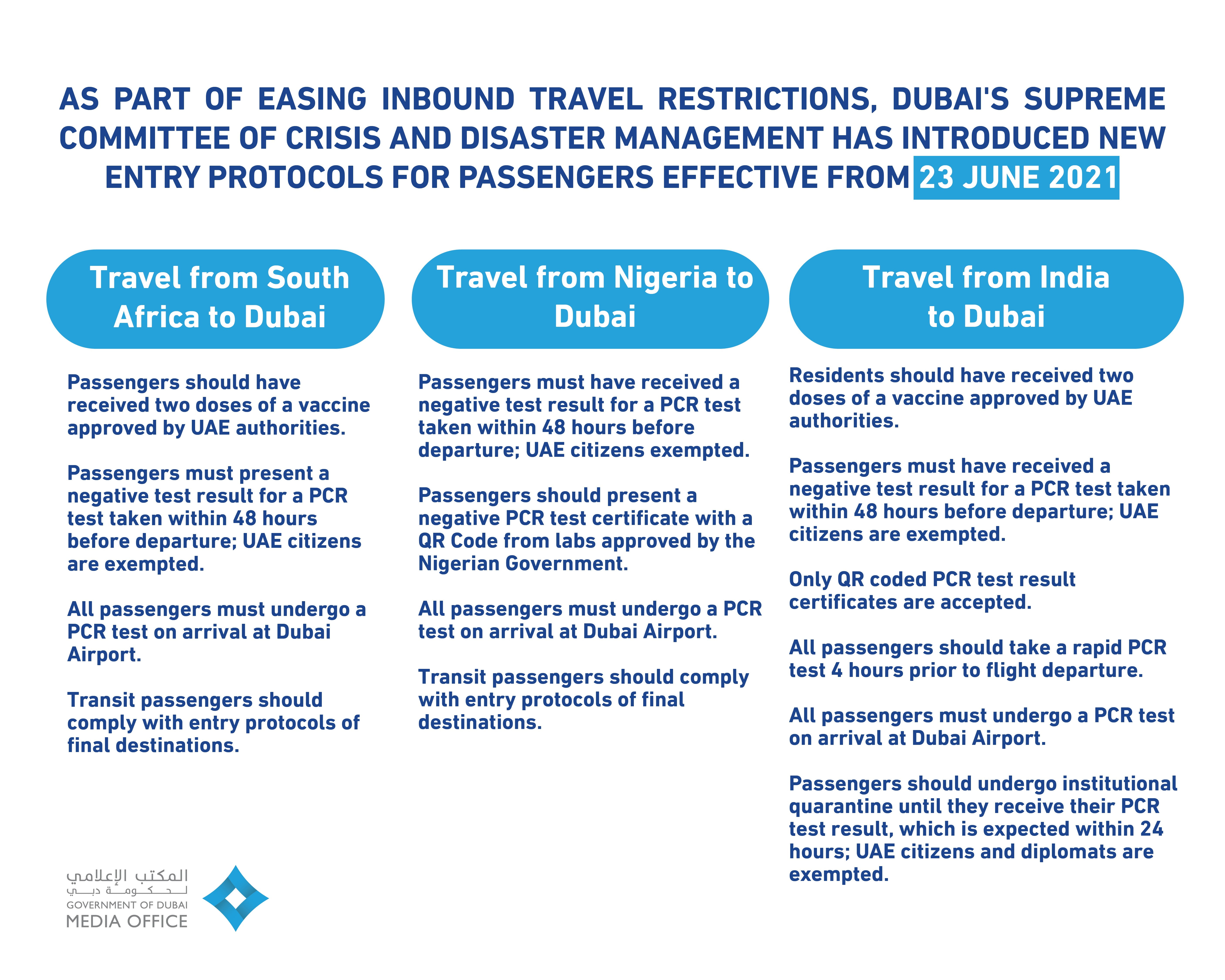 The Supreme Committee of Crisis and Disaster Management in Dubai, headed by HH Sheikh Mansoor bin Mohammed bin Rashid Al Maktoum, announced updates to Dubai’s travel protocols for inbound passengers from South Africa, Nigeria and India, effective from Wednesday 23 June 2021.