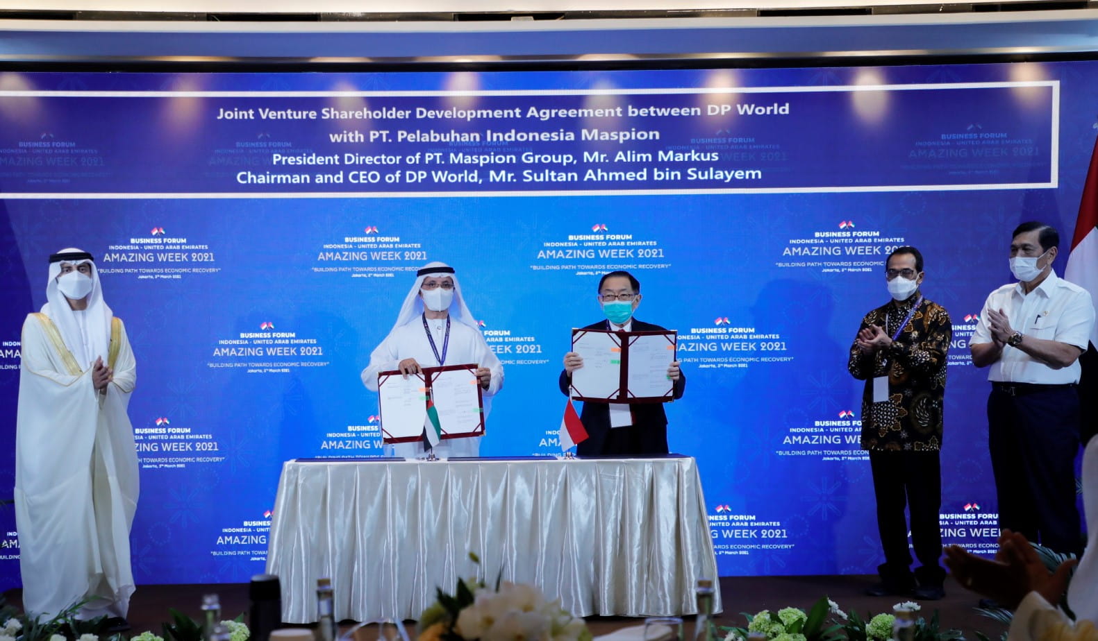 The signing ceremony was held in the presence of the HE Suhail Al Mazrouei, UAE Minister of Energy and Infrastructure, and Luhut Binsar Pandjaitan, Coordinating Minister for Maritime and Investment Affairs of the Republic of Indonesia, in Jakarta at the Indonesia-Emirates Amazing Week 2021 Building Path Towards Economic Recovery business forum. The signatories of the formal agreements are Sultan Ahmed bin Sulayem, Group Chairman and CEO of DP World, and Dr. Alim Markus, Chairman and CEO of Maspion Group.