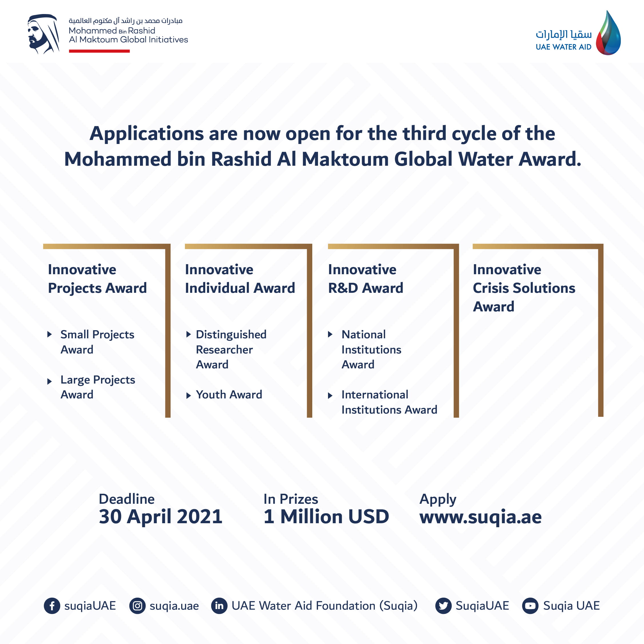 All companies, research centres, R&D institutes, innovators and youth from all over the world, who have developed innovative technologies capable of addressing the challenge of water scarcity, are invited to register in the 3rd cycle of the Award before April 30, 2021. Applicants must register via the website: www.suqia.ae