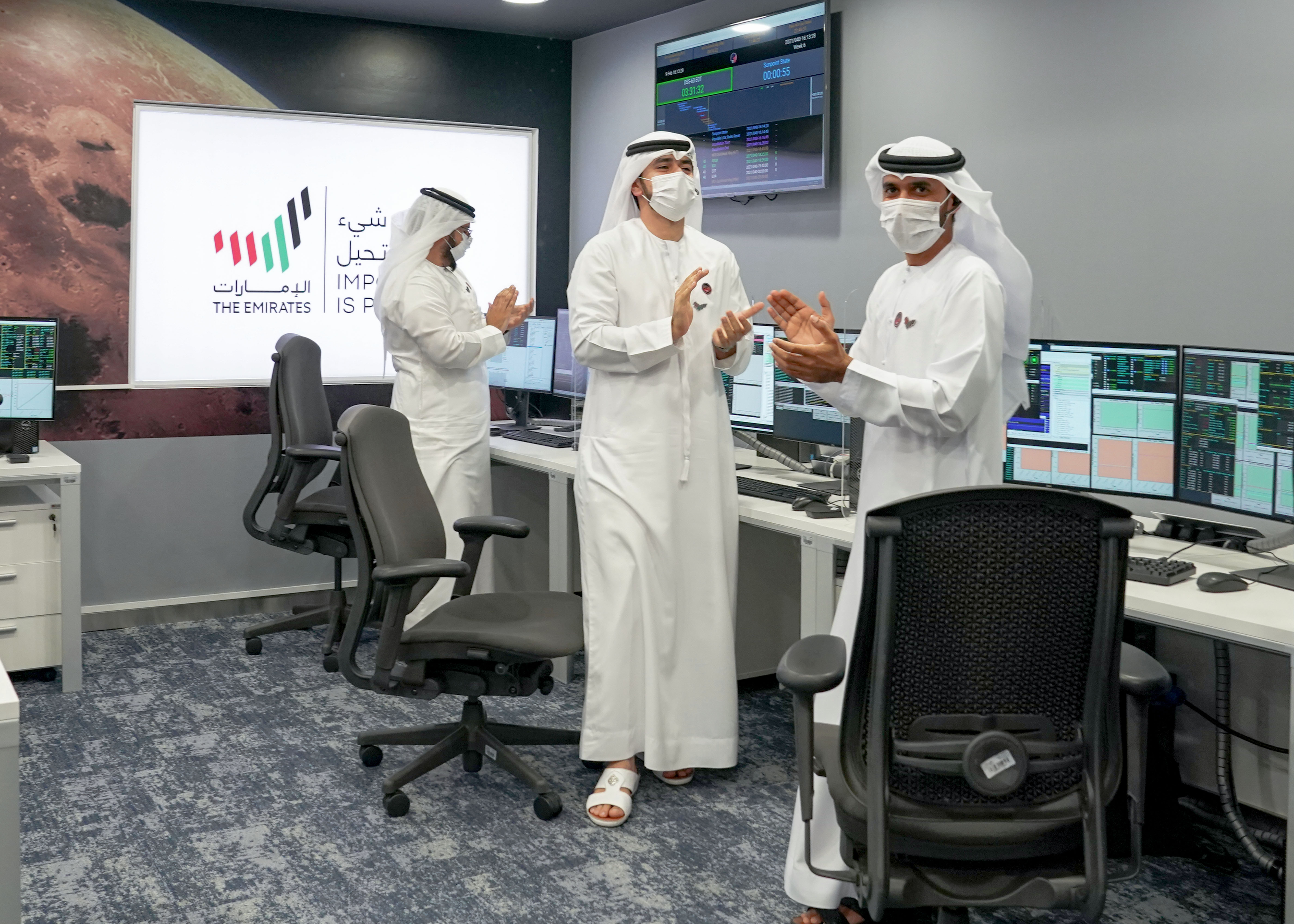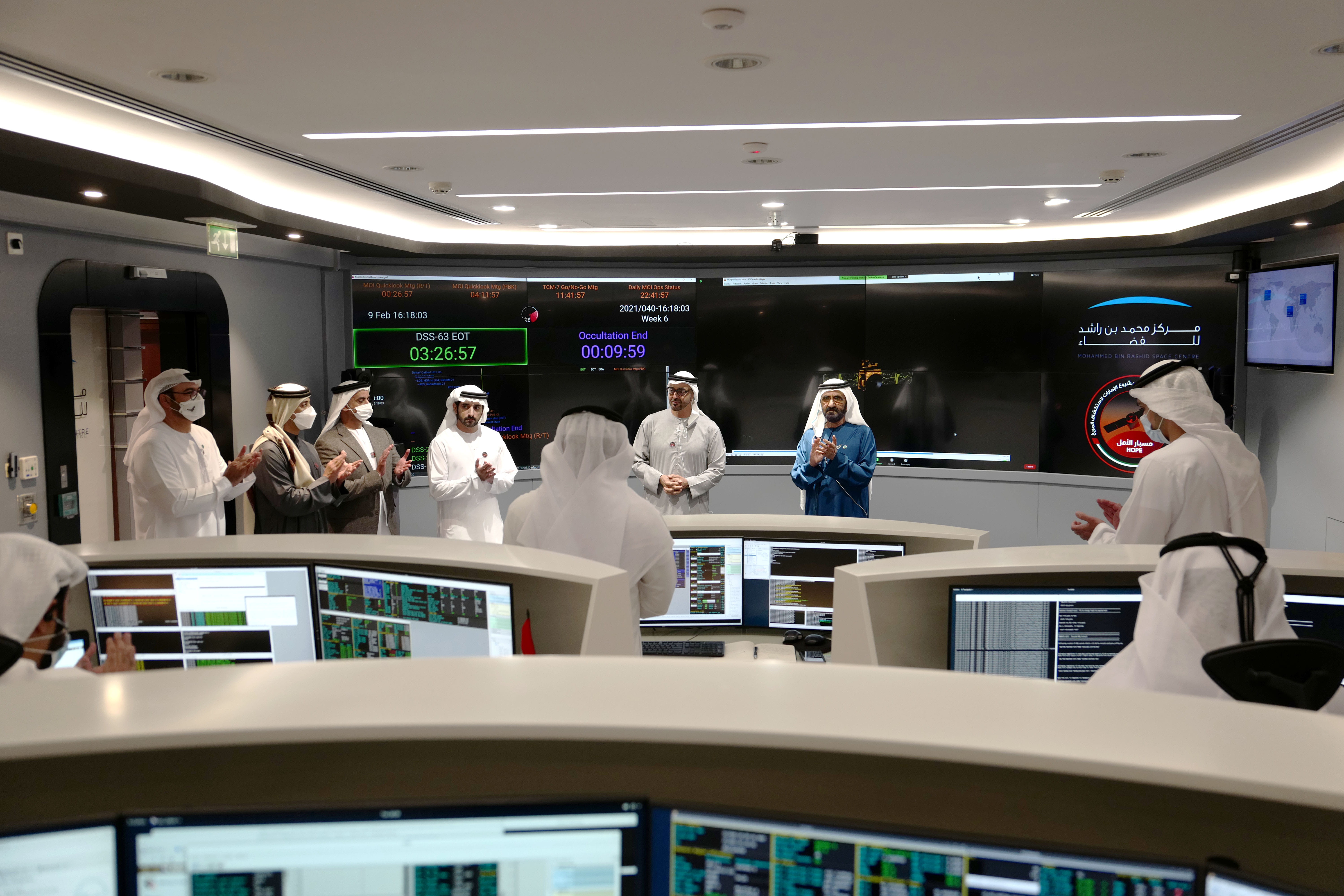 The Rulers of Dubai and Abu Dhabi celebrated the project as a great success for the UAE, the wider Arab region and the global scientific community following six years of technical and logistical efforts to complete the project. They hailed the team of engineers and scientists behind the project who made it a reality after relentless efforts. His Highness Sheikh Mohammed bin Rashid Al Maktoum, Vice President and Prime Minister of the UAE and Ruler of Dubai; and His Highness Sheikh Mohamed bin Zayed Al Nahyan, Crown Prince of Abu Dhabi and Deputy Supreme Commander of the UAE Armed Forces witnessed the historic moment at the Ground Control Station at the Mohammed Bin Rashid Space Centre in Al Khawaneej in the presence of His Highness Sheikh Hamdan bin Mohammed bin Rashid Al Maktoum, Crown Prince of Dubai, Chairman of The Executive Council of Dubai and Chairman of the Mohammed Bin Rashid Space Centre; His Highness Lieutenant General Sheikh Saif bin Zayed Al Nahyan, Deputy Prime Minister and Minister of Interior; and His Highness Sheikh Mansour bin Zayed Al Nahyan, Deputy Prime Minister and Minister of Presidential Affairs.