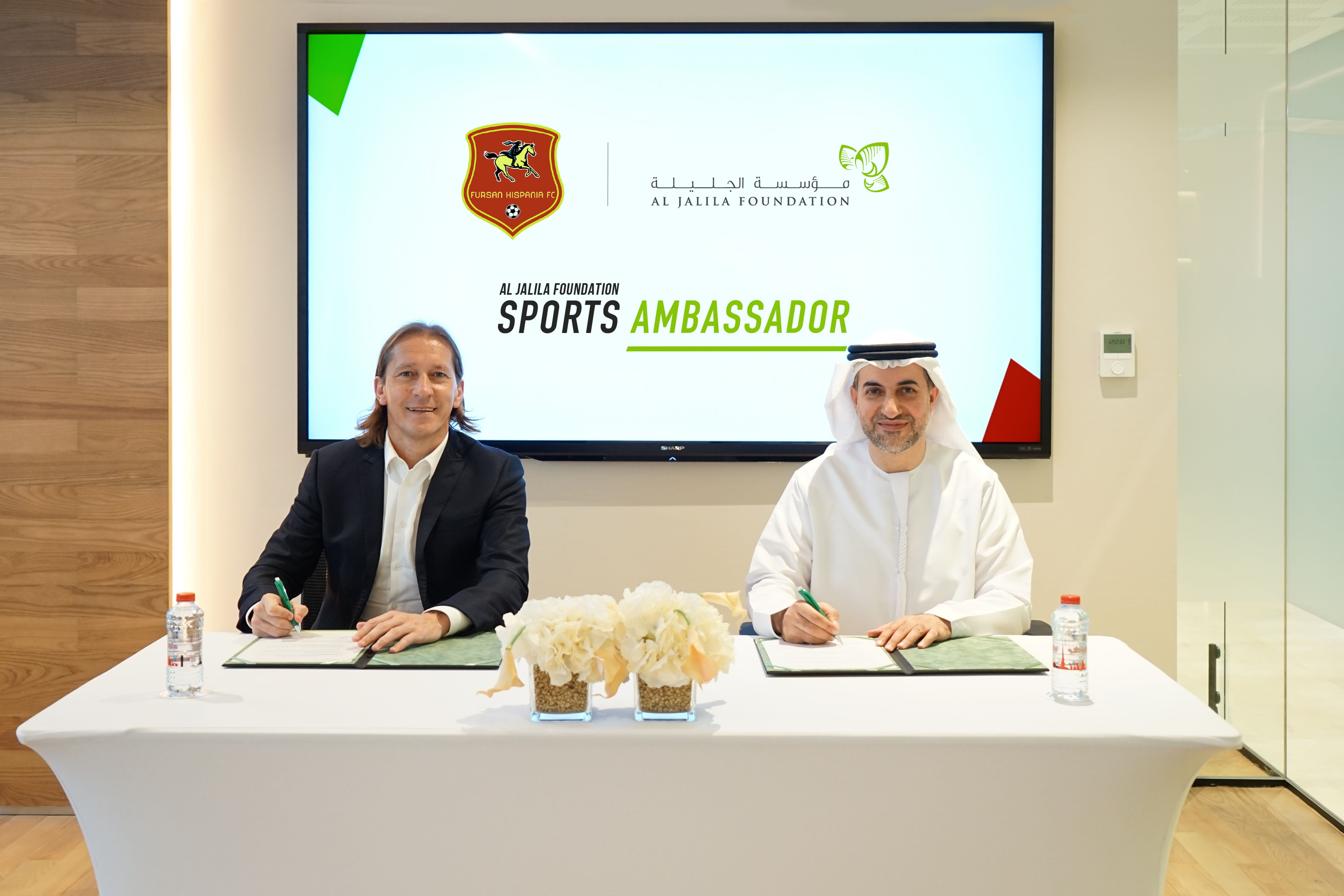 Dr. Abdulkareem Sultan Al Olama, the Chief Executive Officer of Al Jalila Foundation, welcomed Michel Salgado to Al Jalila Foundation for a signing ceremony to commence the sportsman’s commitment to giving back to the community.