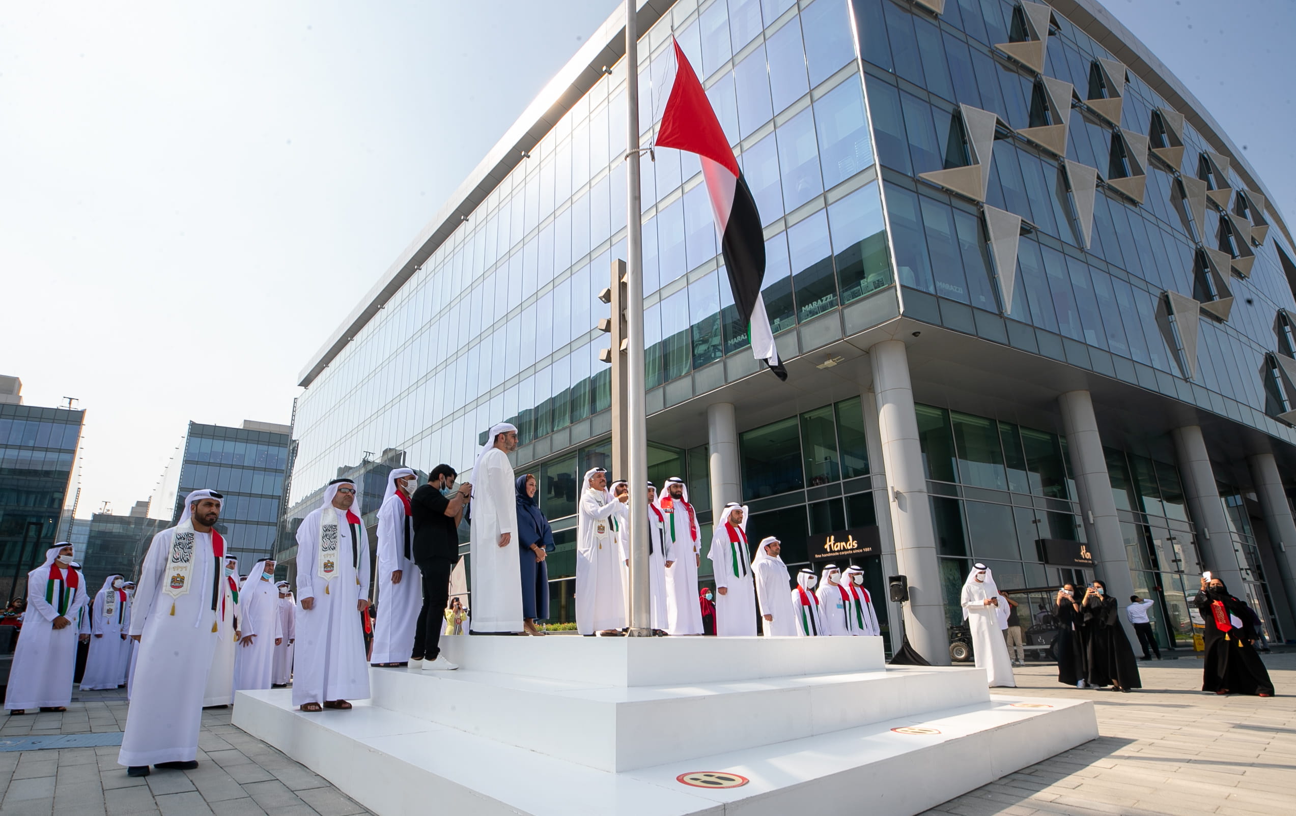 The national anthem was played at the flag-raising ceremony, in the presence of a large crowd of employees, who all draped the UAE flags across their shoulder to mark the celebrations.