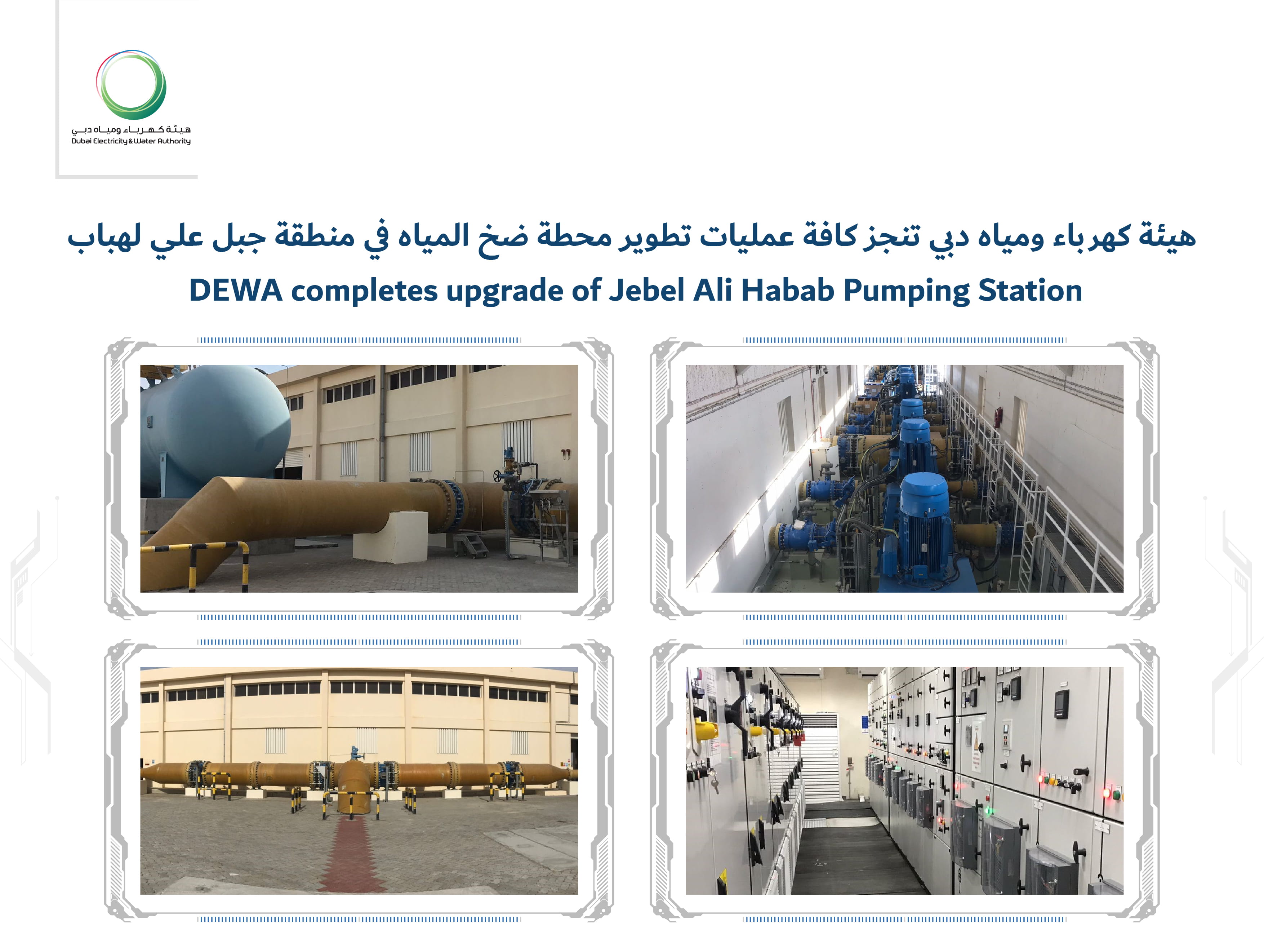 Dubai Electricity and Water Authority (DEWA) has 100% completed the upgrade of Jebel Ali Habab Pumping Station Phase-II & III. The total capacity of water connections at the station is 36 Million Imperial Gallons Per Day (MIGD), with a total cost of AED 67.44 million. The upgrade process aims to promote the automation of water pumping, energy conservation, and increasing the production capacity as well as reduction of pump and motor breakdowns.
