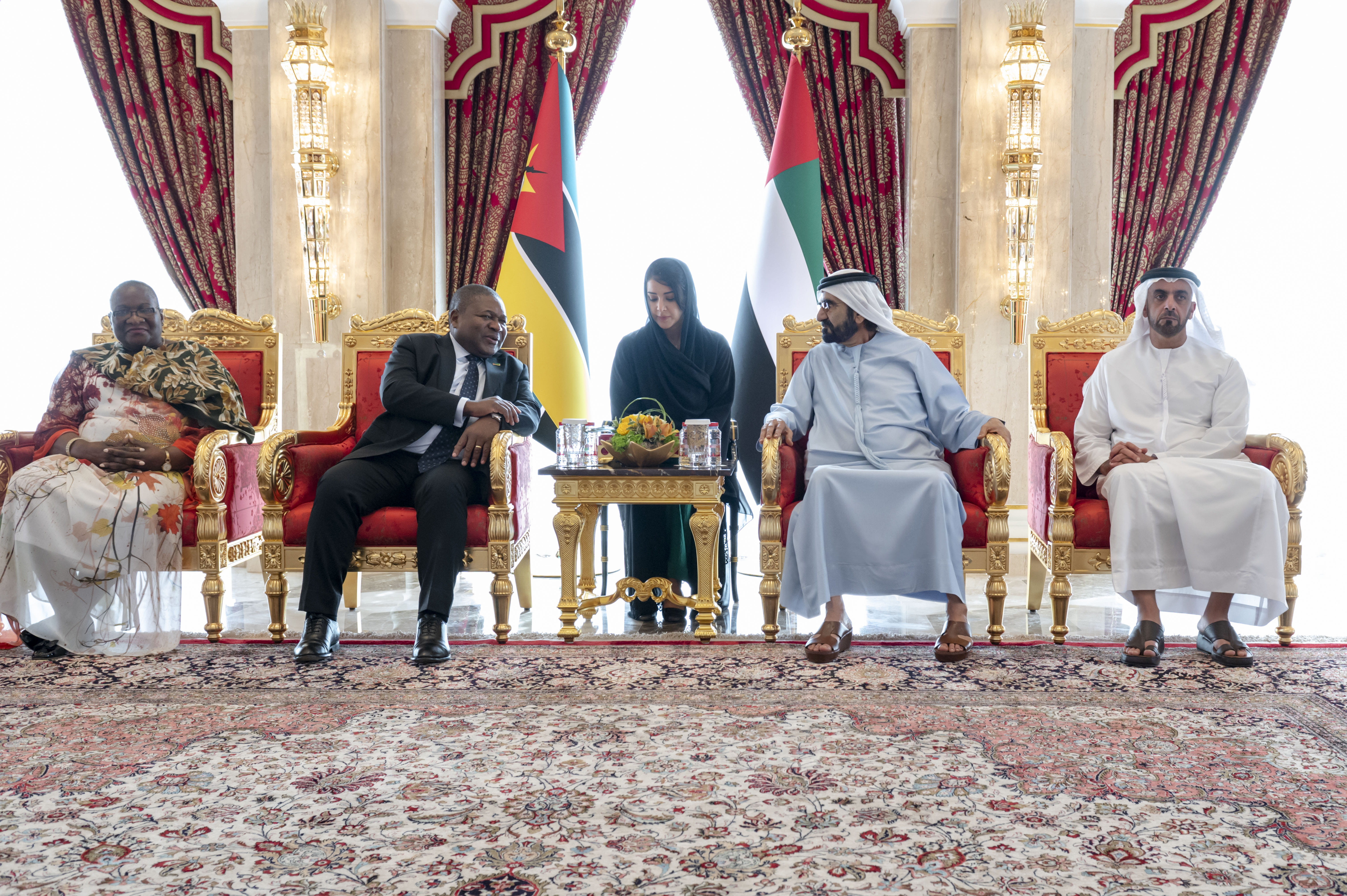 His Highness Sheikh Mohammed bin Rashid welcomed the President of Mozambique in the presence of His Highness Sheikh Hamdan bin Mohammed bin Rashid Al Maktoum, Crown Prince of Dubai; His Highness Sheikh Maktoum bin Mohammed bin Rashid Al Maktoum, Deputy Ruler of Dubai, and Deputy Prime Minister and Minister of Finance of the UAE; and Lieutenant General His Highness Sheikh Saif bin Zayed Al Nahyan, Deputy Prime Minister and Minister of Interior.