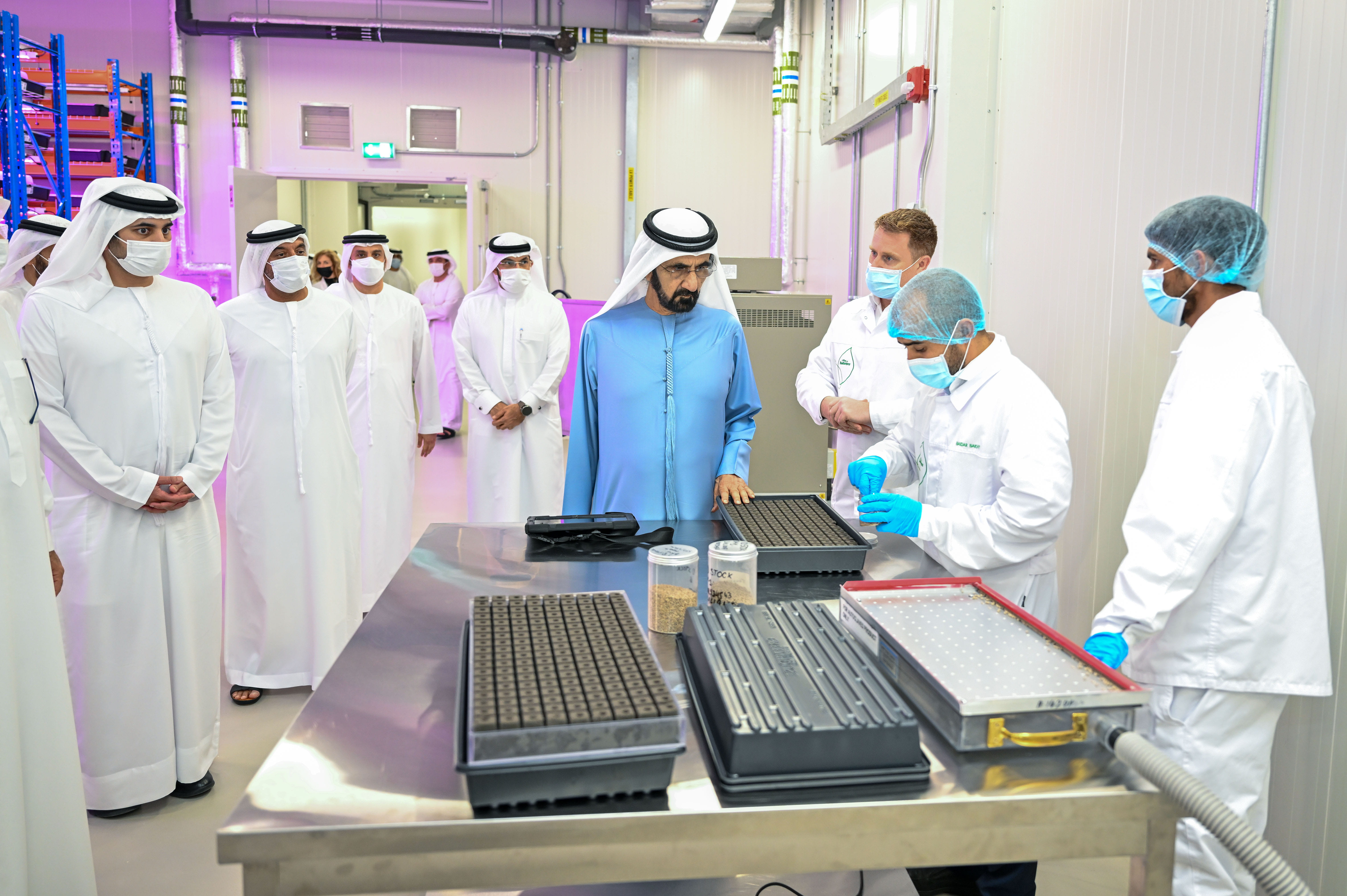 His Highness Sheikh Mohammed bin Rashid Al Maktoum, Vice President and Prime Minister of the UAE and Ruler of Dubai, toured Emirates Crop One (ECO 1), the world’s largest vertical hydroponic farm that recently opened in Dubai. Accompanying His Highness on the tour were His Highness Sheikh Maktoum bin Mohammed bin Rashid Al Maktoum, Deputy Ruler of Dubai, and Deputy Prime Minister and Minister of Finance of the UAE, and His Highness Sheikh Ahmed bin Saeed Al Maktoum, President of Dubai Civil Aviation Authority, Chairman of Dubai Airports, and Chairman and Chief Executive of Emirates Airline and Group.