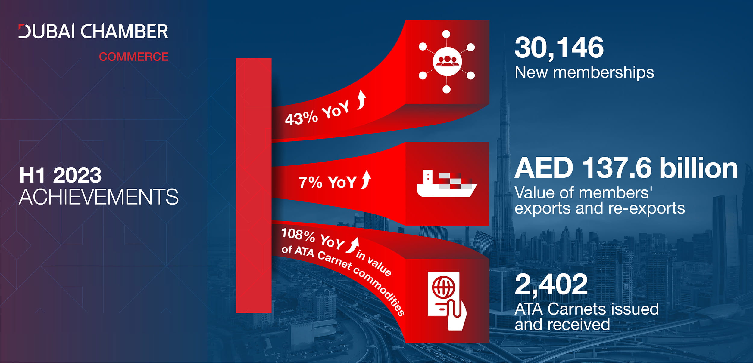 Dubai Chamber of Commerce, one of the three chambers operating under the umbrella of Dubai Chambers, has announced a series of significant accomplishments made during the first half of 2023, including significant growth in the number of member companies and an increase in the value of the exports and re-exports of its members.