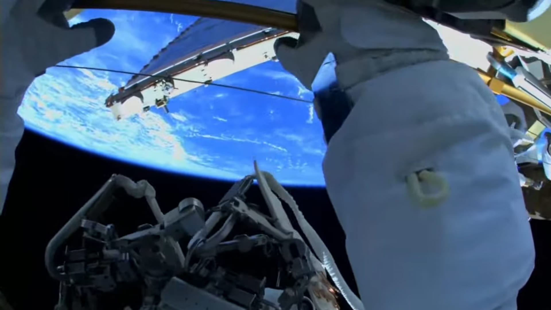 Bowen was out of the hatch connecting his cable to the outside of the hull before anchoring AlNeyadi’s line outside as well. AlNeyadi then disconnected from the inside of the airlock and commenced the tasked activities.