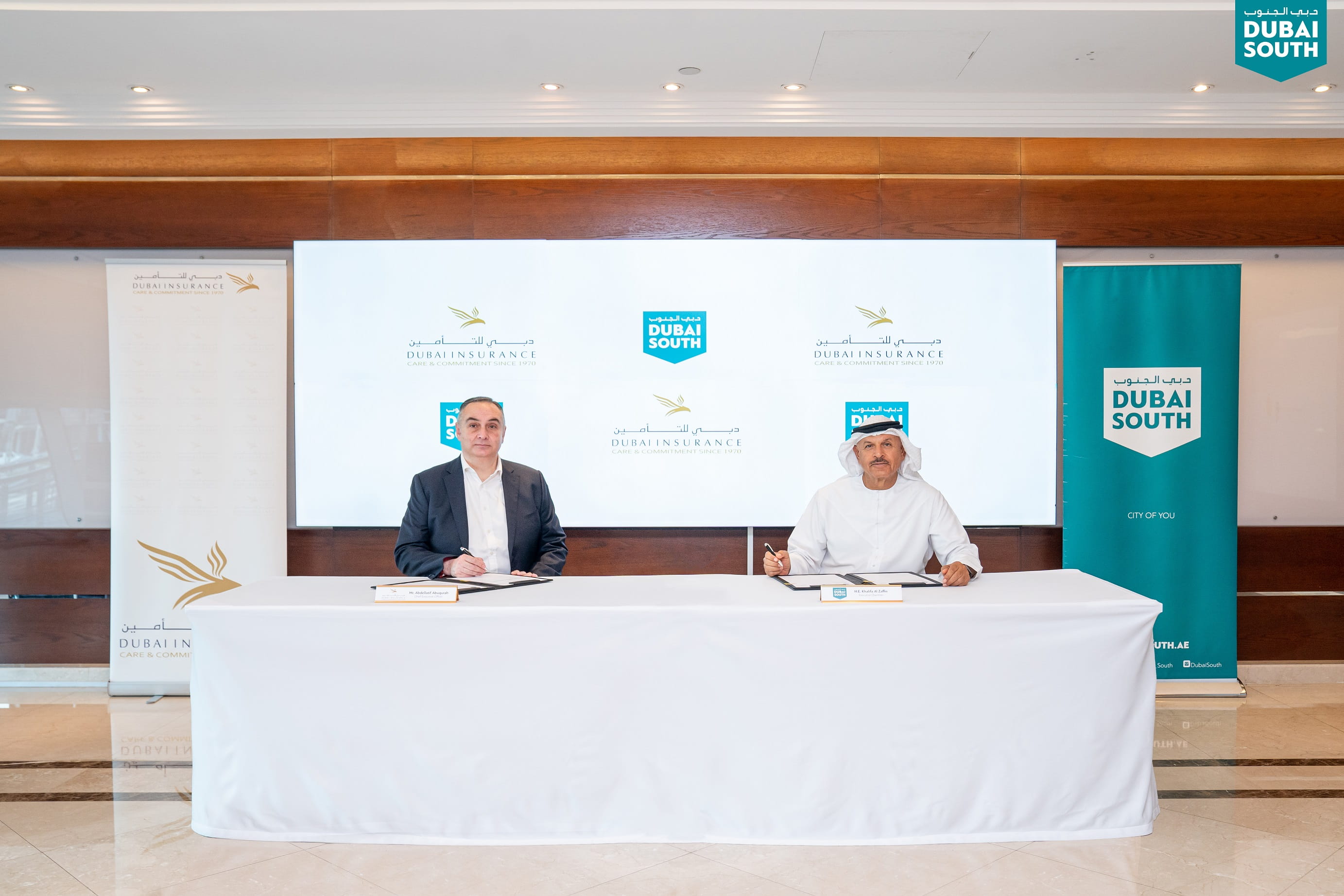 The agreement, which took place at Dubai South HQ, was signed by HE Khalifa Al Zaffin, Executive Chairman of Dubai Aviation City Corporation and Dubai South, and Abdellatif Abuqurah, CEO of Dubai Insurance, in the presence of senior executives from both entities.