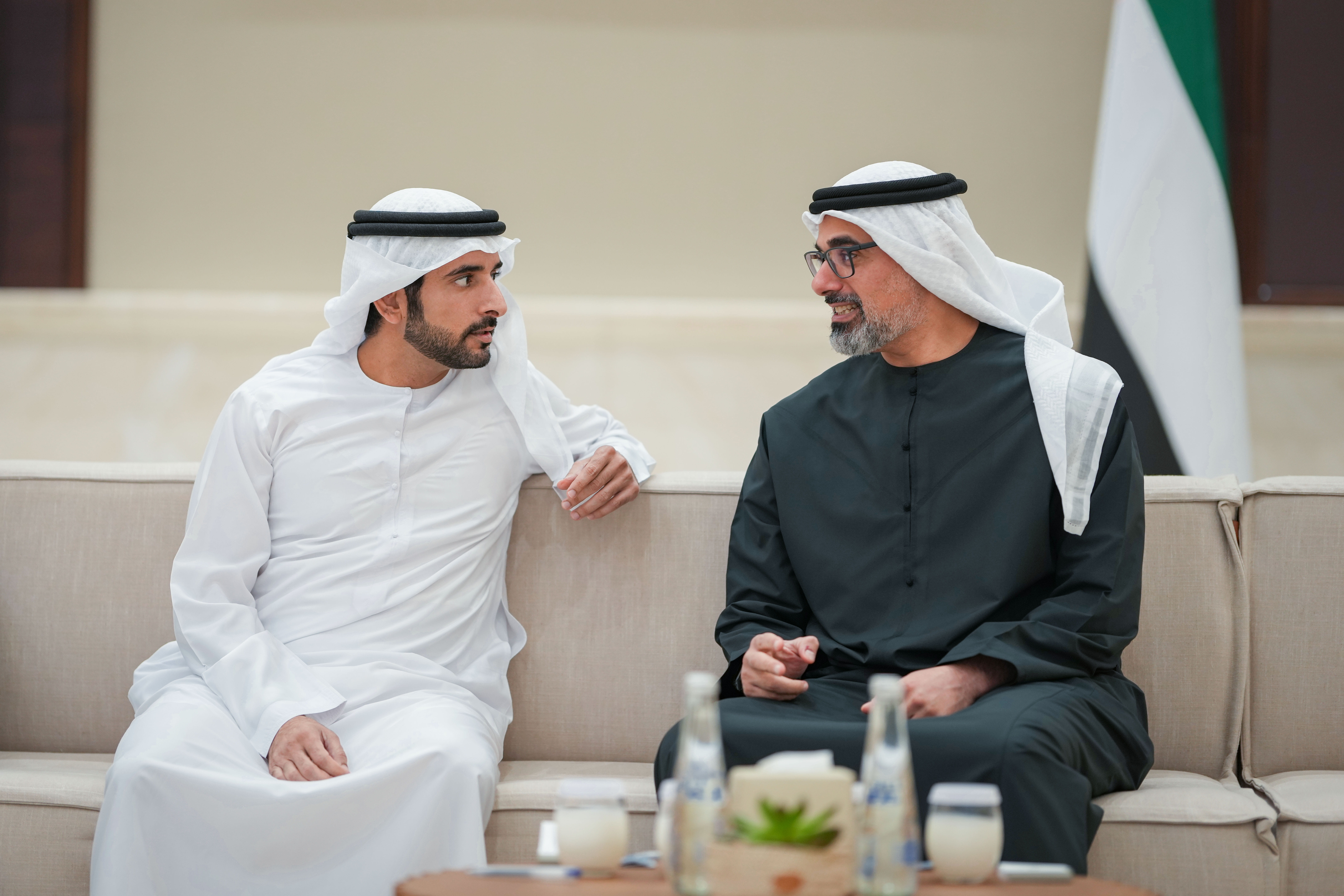 H.H. Sheikh Khaled bin Mohamed bin Zayed Al Nahyan, Crown Prince of Abu Dhabi and Chairman of the Abu Dhabi Executive Council, has received H.H. Sheikh Hamdan bin Mohammed bin Rashid Al Maktoum, Crown Prince of Dubai and Chairman of the Executive Council of Dubai, today at Al Bateen Palace, where they engaged in warm discussions about the importance of promoting community ties and Emirati values of compassion and generosity during Ramadan.