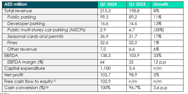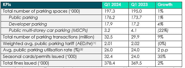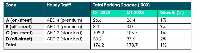 The Company cemented its position as the leading provider of parking solutions in Dubai with 197.3k spaces at end of Q1 2024 (Q1 2023: 195.0k).
