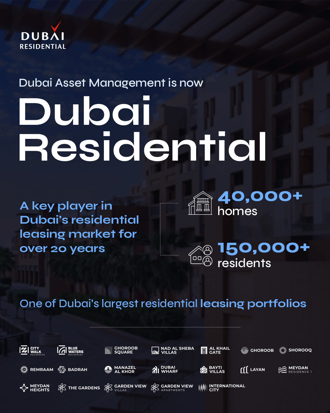 Dubai Residential’s comprehensive portfolio now includes City Walk Residences, Bluewaters Residences, Remraam, Shorooq, Ghoroob, Badrah, Manazel Al Khor, Ghoroob Square, Meydan Residence 1, Layan, Bayti Villas, Nad Al Sheba Villas, Dubai Wharf, Meydan Heights, The Gardens, Garden View Villas, Garden View Apartments, Al Khail Gate and International City.