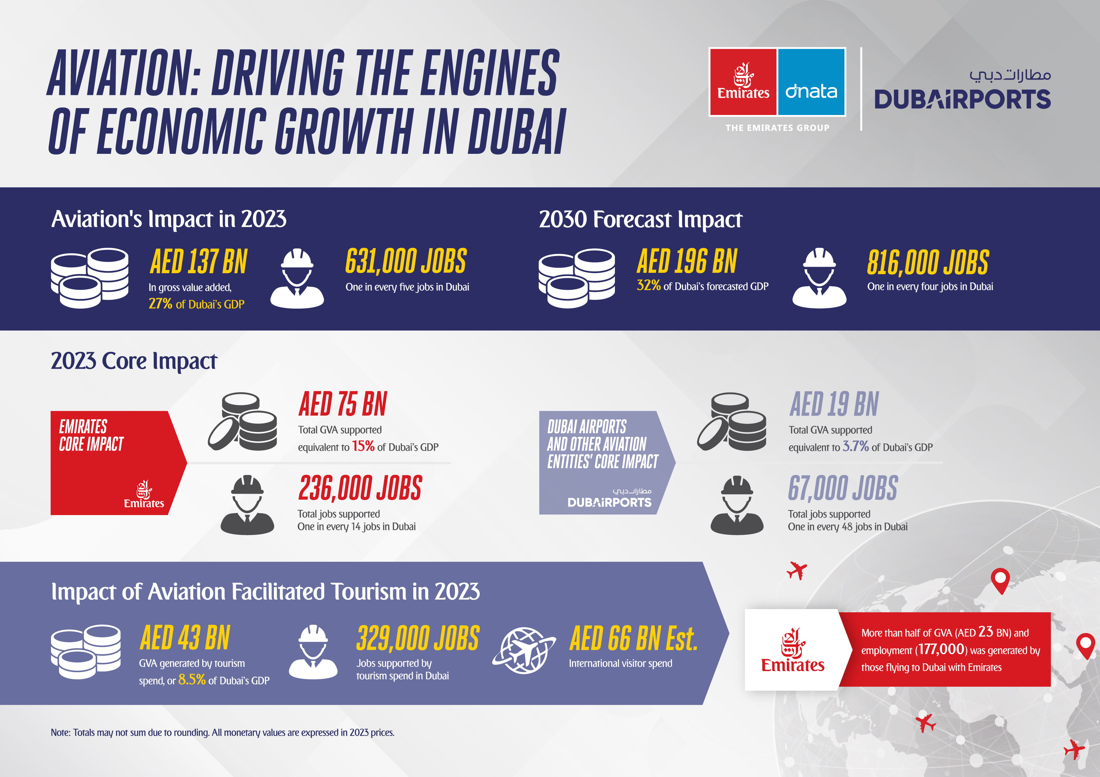 In 2023, Dubai’s aviation sector, consisting of Emirates Group, Dubai Airports (including Dubai International and Dubai World Central - Al Maktoum airports), and other aviation sector entities¹ are estimated to have supported AED 137 billion (USD 37.3 billion) in gross value added² (GVA), equivalent to 27% of Dubai’s GDP. This included the core economic impact of AED 94 billion, and AED 43 billion from the catalytic impact of aviation-facilitated tourism. These figures are projected to increase steadily, with aviation activities facilitated by Emirates and Dubai Airports contributing AED 196 billion, or 32% of Dubai’s forecasted GDP by 2030 (in 2023 prices).