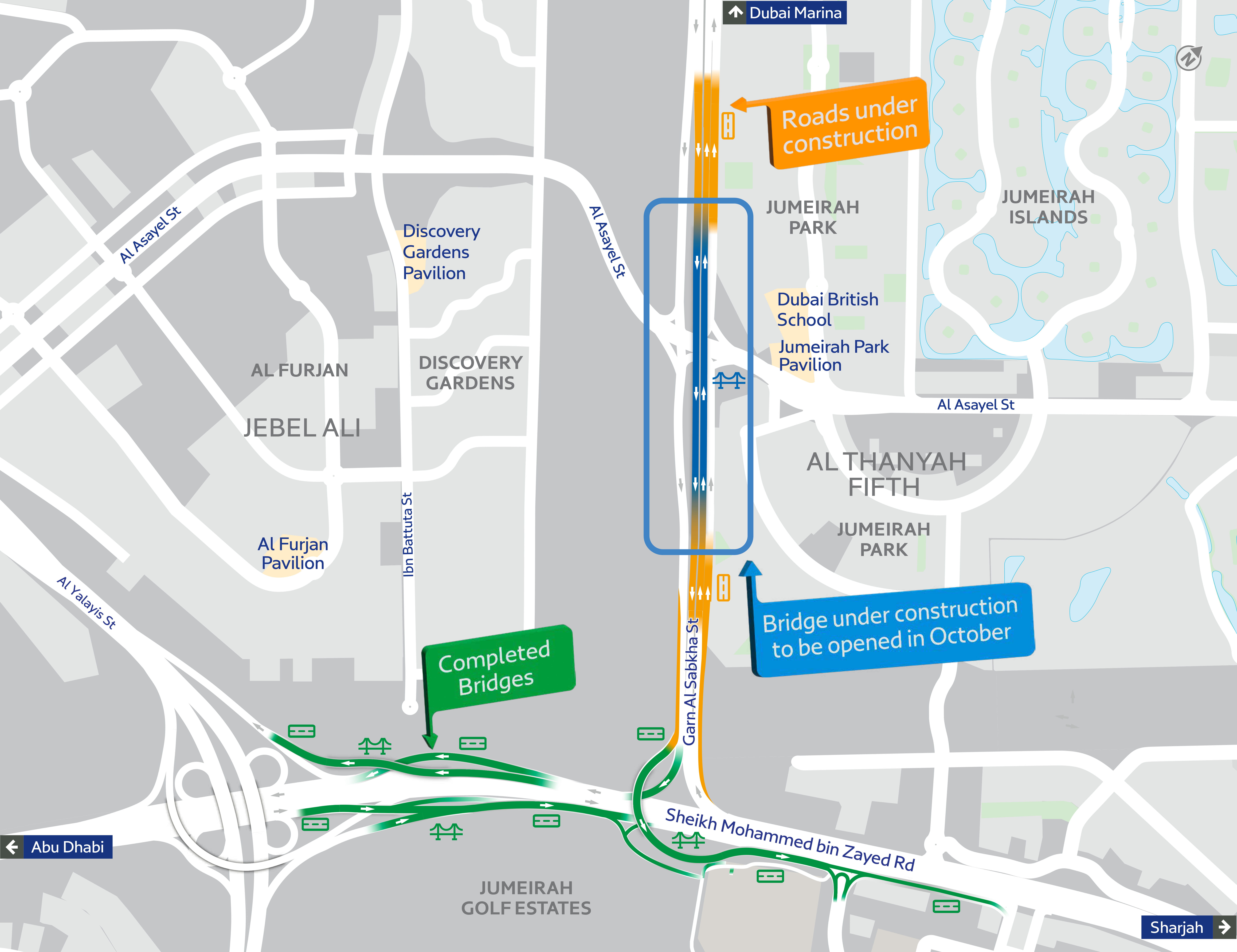 All project works are set to be completed this October with the opening of the final bridge, which will connect the intersection of Garn Al Sabkha Street with Al Asayel Street. This bridge spans 943 metres, with two lanes in each direction, and is designed to handle 8,000 vehicles per hour in total. It will ensure seamless traffic flow between Sheikh Zayed Road and Sheikh Mohammed bin Zayed Road.