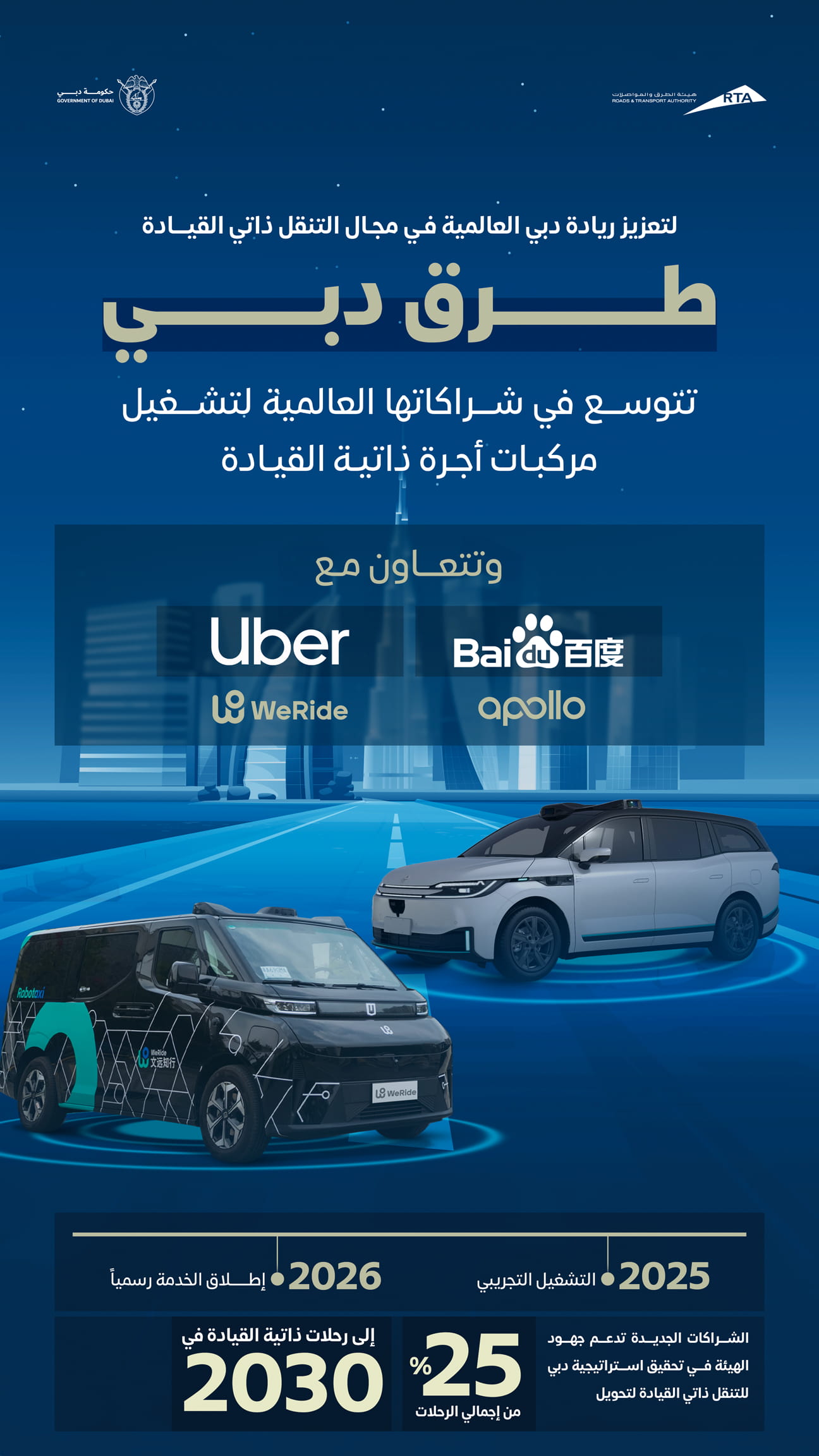 Al Tayer added: “Uber, starting with WeRide, and Baidu through Apollo Go will commence trials of autonomous taxis in Dubai this year, with a safety driver seated behind the wheel, in preparation for the driverless commercial launch in 2026. The broader rollout of autonomous vehicles will mark a transformative shift in Dubai’s transport landscape and further strengthen RTA’s efforts to enhance network integration by facilitating smoother mobility for public transport users.”