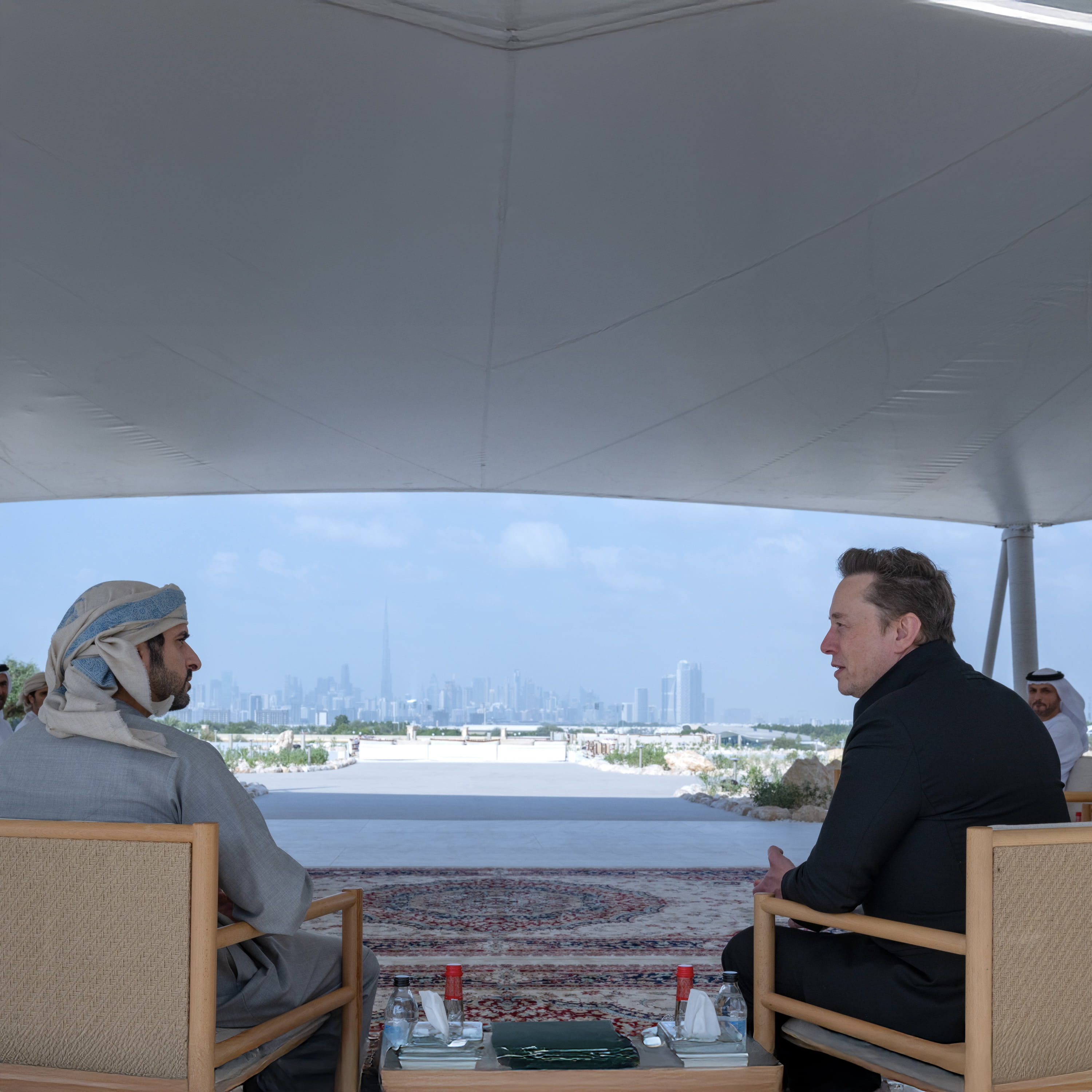 His Highness Sheikh Hamdan bin Mohammed bin Rashid Al Maktoum, Crown Prince of Dubai, Deputy Prime Minister and Minister of Defence of the UAE, and Chairman of The Executive Council of Dubai, met today with Elon Musk, CEO of X, SpaceX, Tesla, and Starlink, in the presence of His Highness Sheikh Maktoum bin Mohammed bin Rashid Al Maktoum, First Deputy Ruler of Dubai, Deputy Prime Minister and Minister of Finance of the UAE.