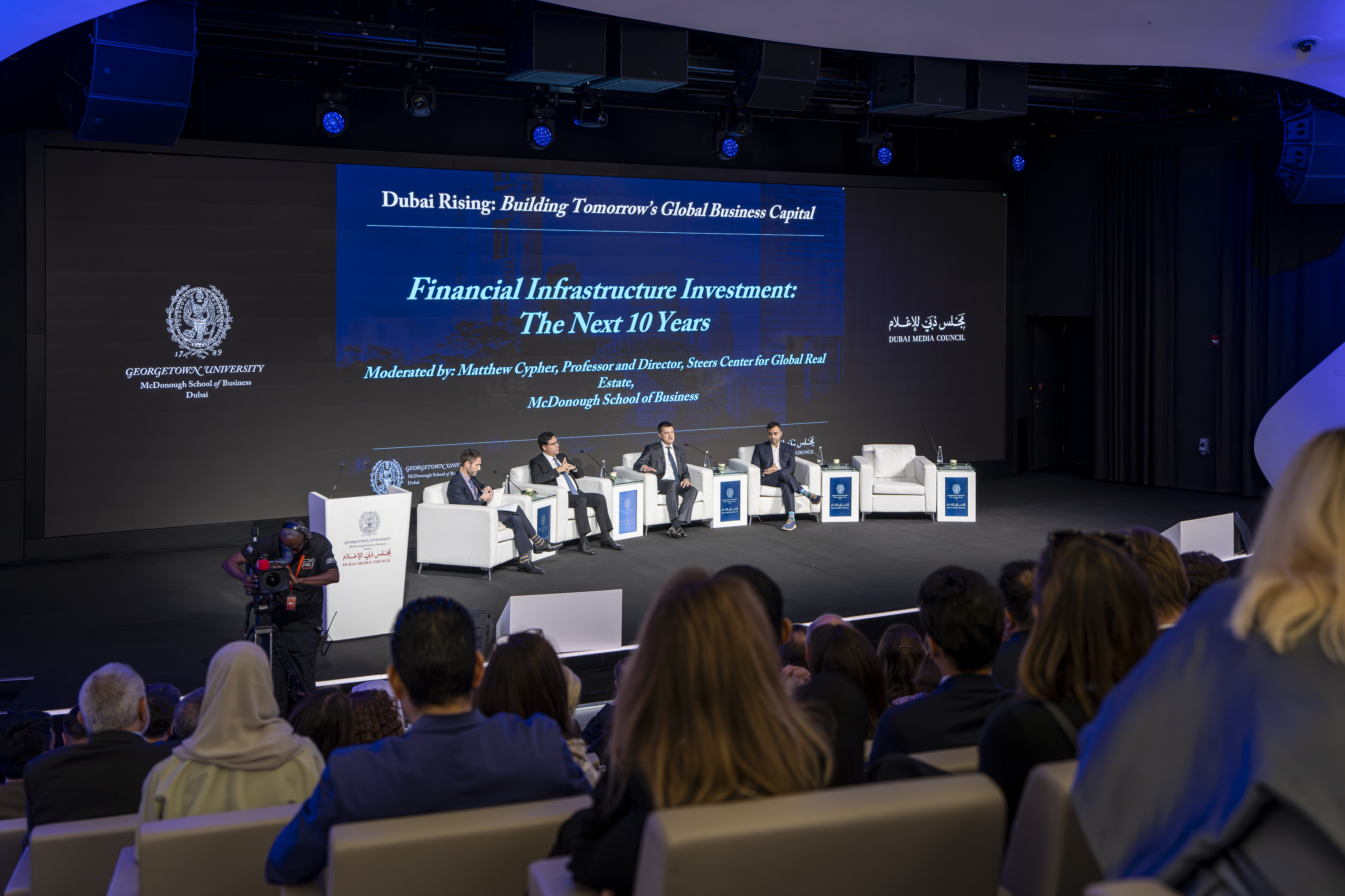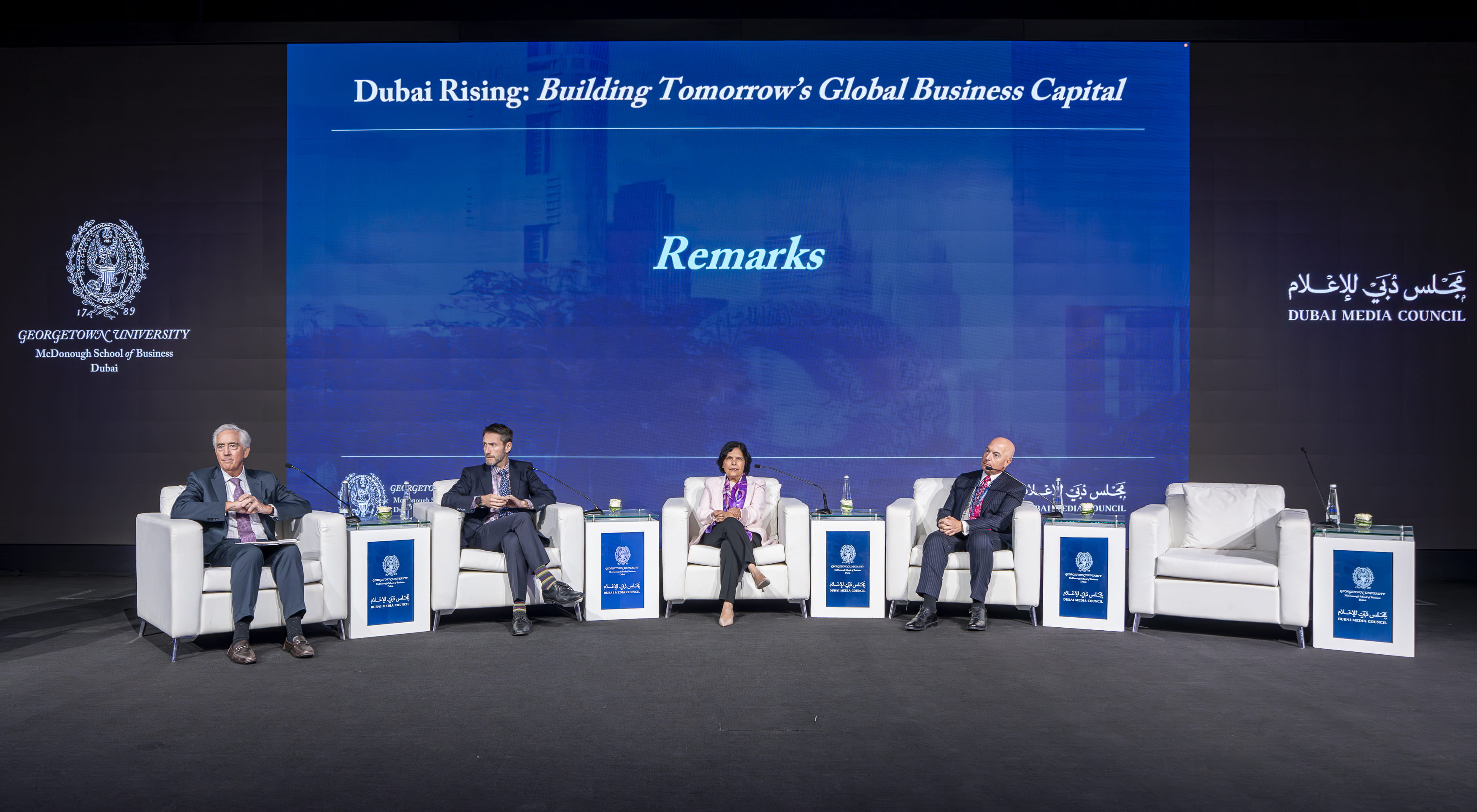 The event concluded with insights from Georgetown’s Psaros Center for Financial Markets and Policy and Steers Center for Global Real Estate, with their benefactors Michael Psaros and Robert Steers, discussing how their research and activities are enriched by the university’s presence in the global business hub operating out of Dubai.