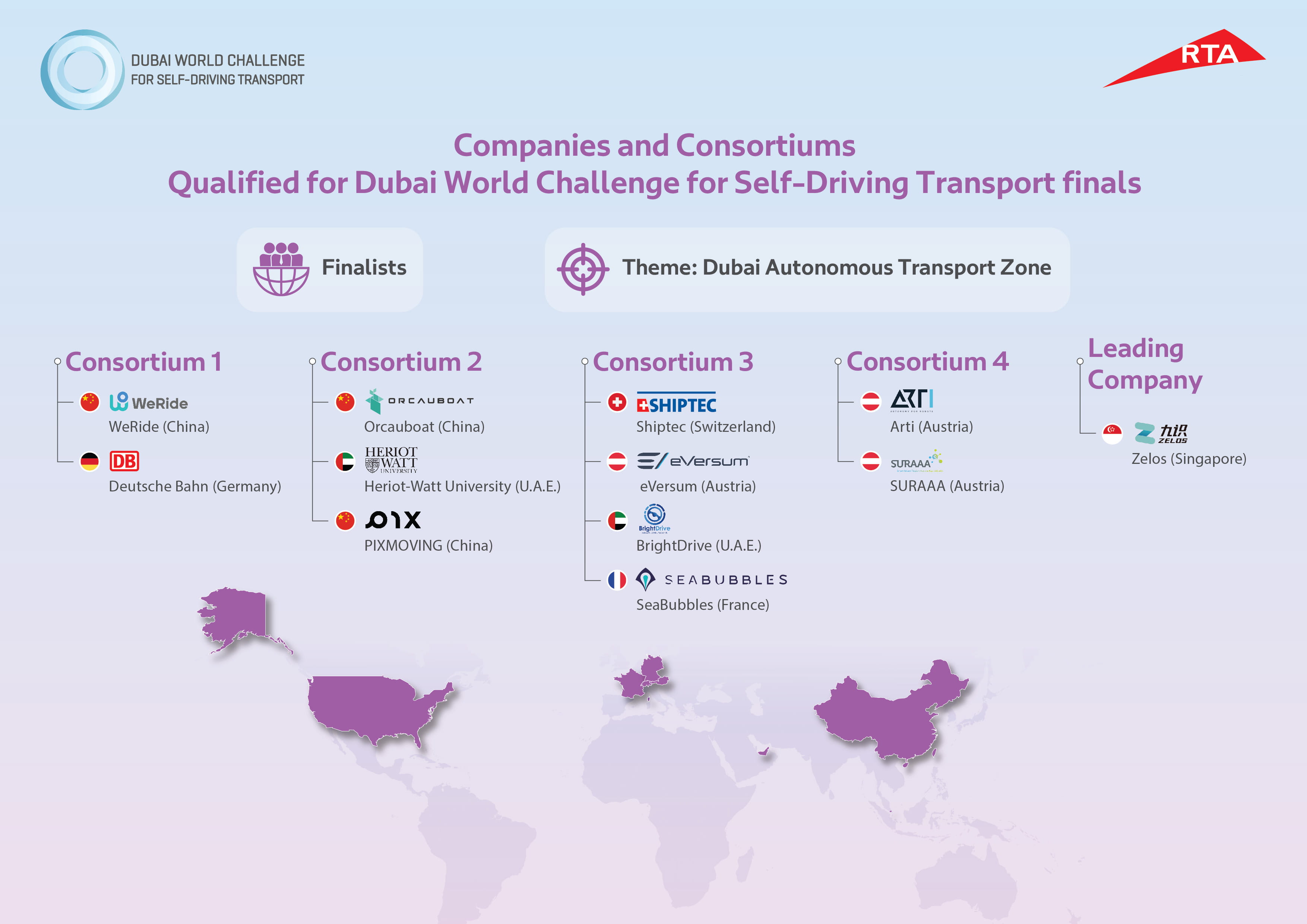 Based on the decision of the global judging panel chaired by Dr. Steven Shladover, an international expert in self-driving transport technologies and Chair of the Judging Panel for the Dubai World Challenge for Self-Driving Transport, five global and local consortiums and companies have advanced to the final stage. These include the WeRide / Deutsche Bahn consortium from the UAE, Germany, and China; the BrightDrive / eVersum / Shiptec / SeaBubbles consortium from Switzerland, France, the UAE, and Austria; the Orcauboat / PIXMOVING / Heriot-Watt University Dubai consortium from the UAE and China; the SURAA / Arti consortium from Austria; and the leading company Zelos from Singapore.