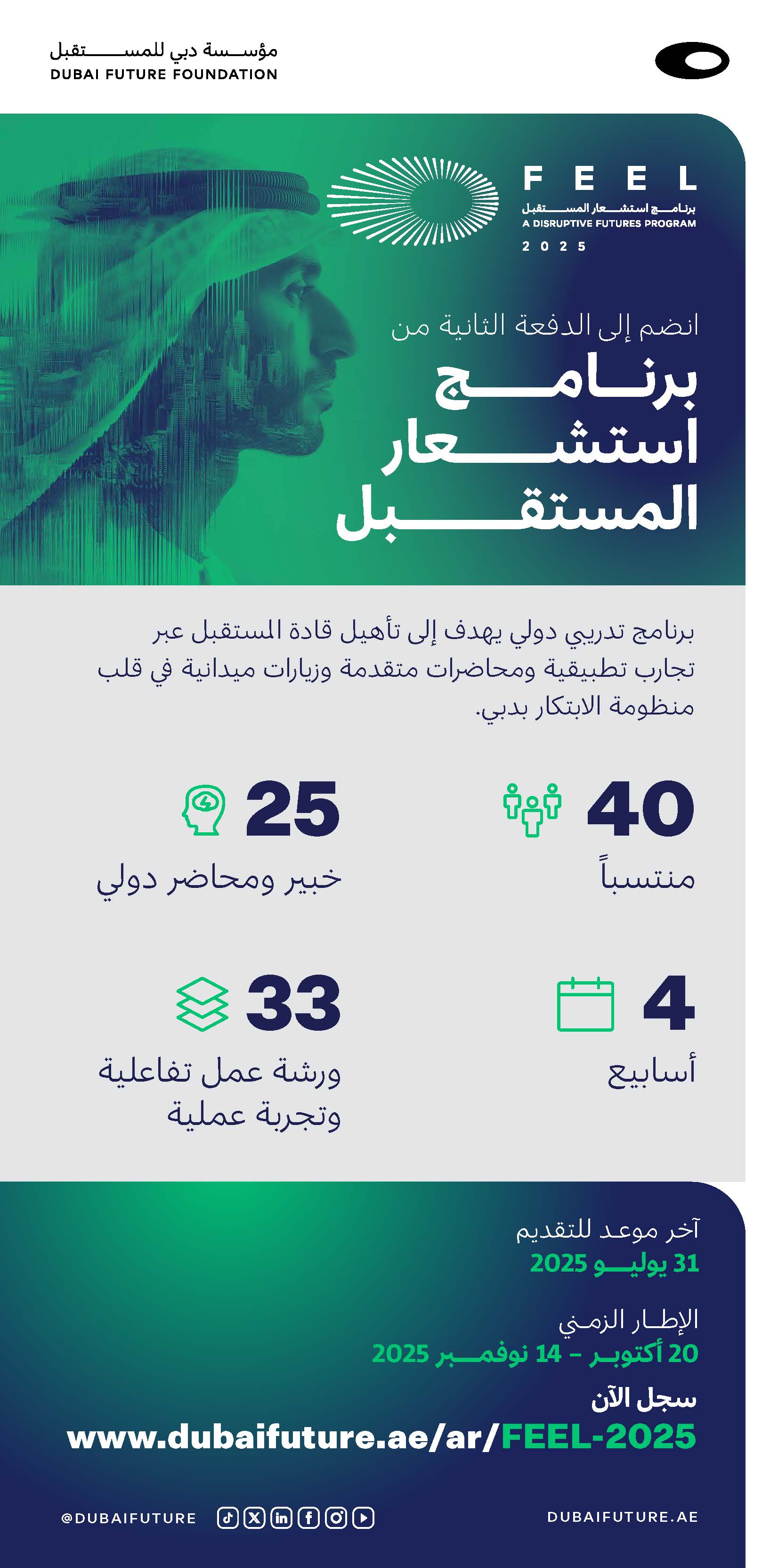 Applications are open until 31 July 2025. Interested individuals can apply via DFF’s website: https://www.dubaifuture.ae/feel/apply.