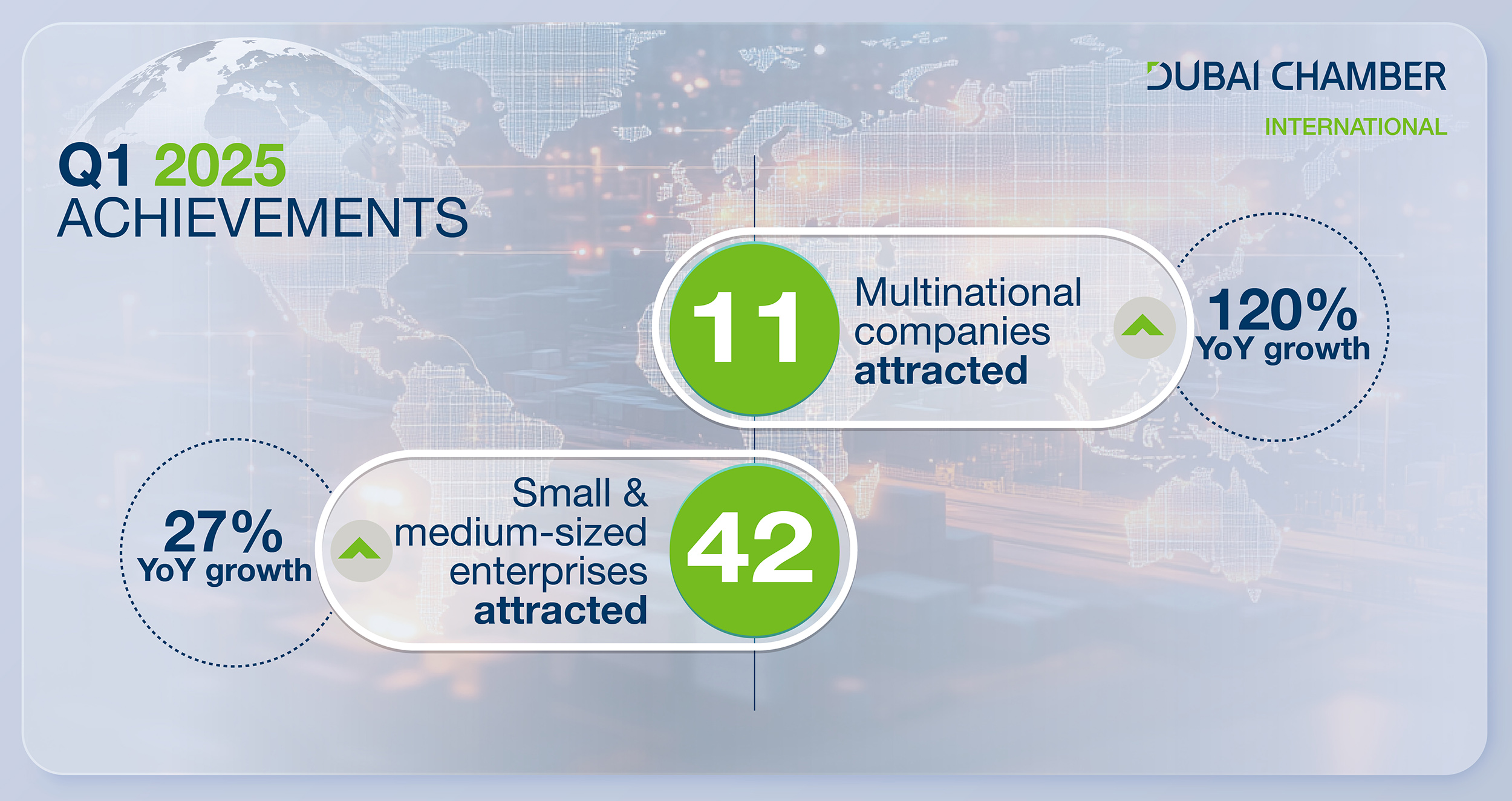 Dubai International Chamber successfully attracted 53 companies to Dubai during Q1 2025, representing a 39% increase compared to 38 companies attracted in Q1 2024. These included 11 multinational companies (MNCs), marking a 120% increase over the five attracted in Q1 2024. Meanwhile, 42 small and medium-sized enterprises (SMEs) were attracted during Q1 2025, representing YoY growth of 27% compared to the 33 attracted during the same period last year.