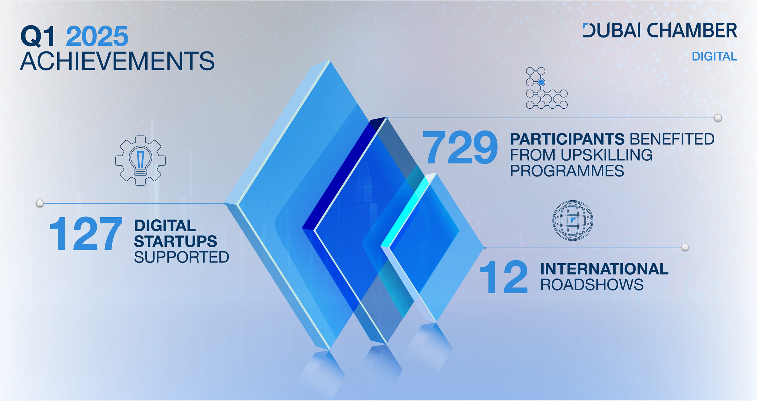 During Q1 2025, the chamber organised four events aimed at supporting the business community, empowering startups, nurturing talent, building partnerships, and enhancing the ease of doing business in Dubai. In addition, 729 participants received training through the chamber’s digital upskilling programmes, which are designed to enhance the capabilities of specialised talent in advanced technology sectors and build a future-ready workforce.