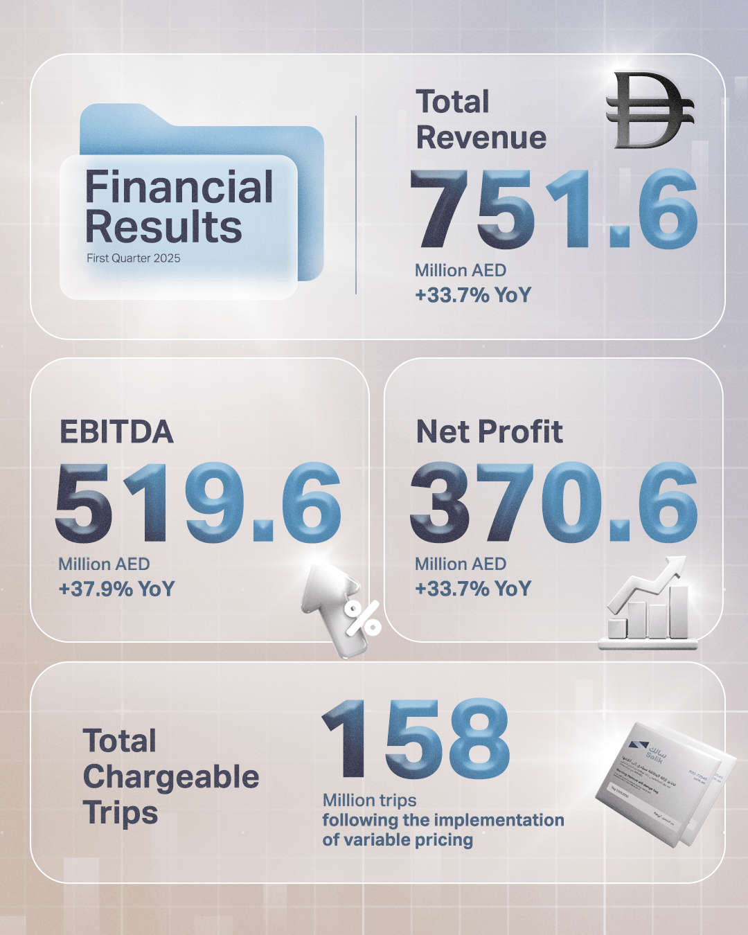 “We’ve entered 2025 with strong momentum, with our core tolling business continuing to thrive, bolstered by the opening of two new toll gates in late 2024. We have also maintained progress in our ancillary revenue streams, with both the Dubai Mall and Parkonic parking partnerships seeing good traction with users in the first quarter. Total chargeable trips, accounting for the new variable pricing, reached 158 million, with total revenue growth exceeding 30%. Profitability is also robust, with EBITDA growth of more than 35%, delivering an industry leading EBITDA margin of 69.1%. A healthy first quarter positions us well for the year ahead and we are pleased to reiterate our full year guidance, with total revenue expected to grow 28-29%, and an EBITDA margin of 68-69% as we continue to strengthen our non-core offering while tapping new opportunities.”