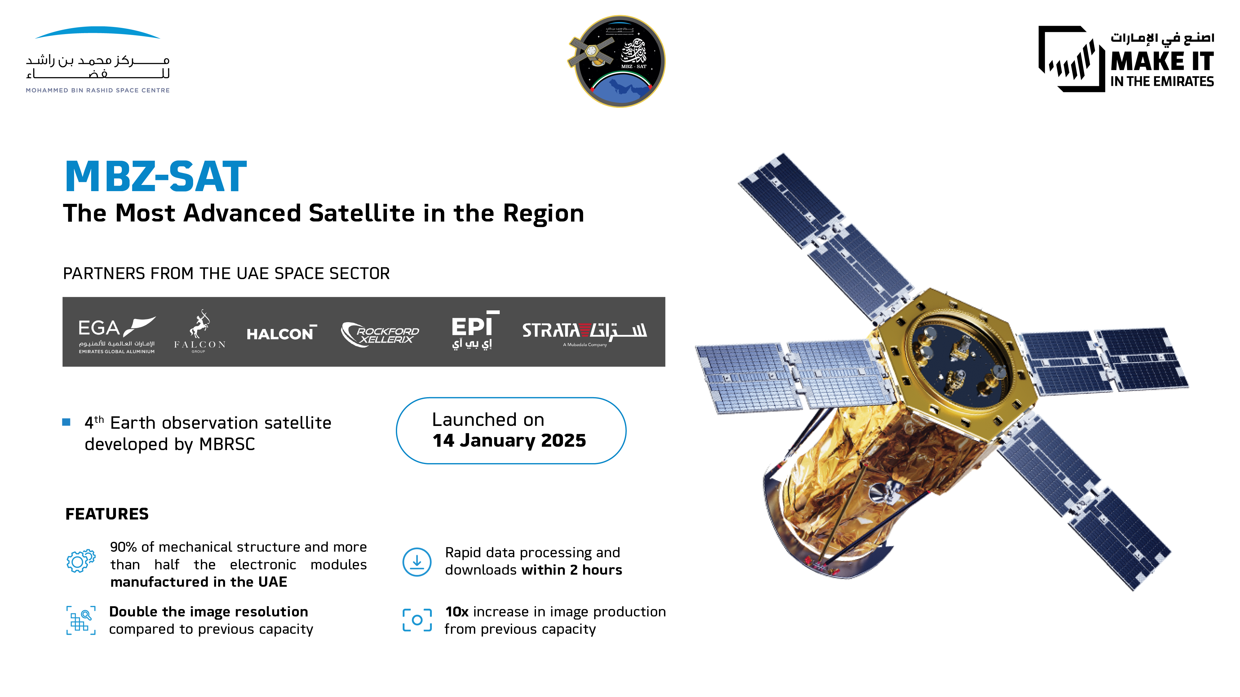 MBZ-SAT, fully developed by Emirati engineers, represents a new era for the UAE’s space sector, with 90% of its mechanical components and a significant portion of its electronic systems sourced from UAE-based companies. Local entities such as Strata, EPI, Rockford Xellerix, HALCON, Falcon, and Emirates Global Aluminium (EGA) contributed advanced components, expertise, and solutions, demonstrating the strength of the nation’s private sector in delivering world-class aerospace technology.