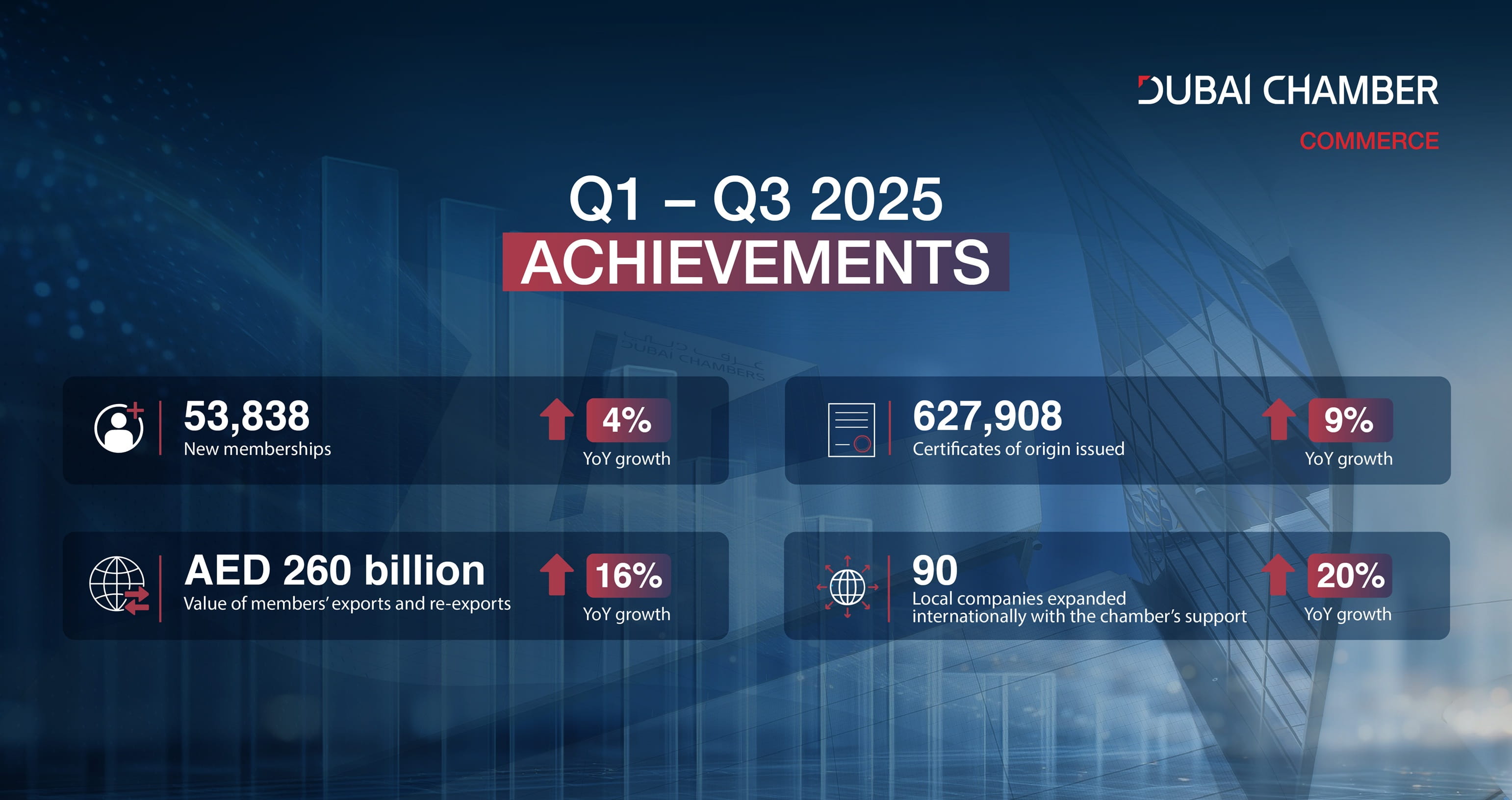 During the first nine months of 2025, Dubai Chamber of Commerce successfully supported the international expansion of 90 local companies. This represents strong growth of 20% compared to the 75 companies supported during the same period in 2024.
