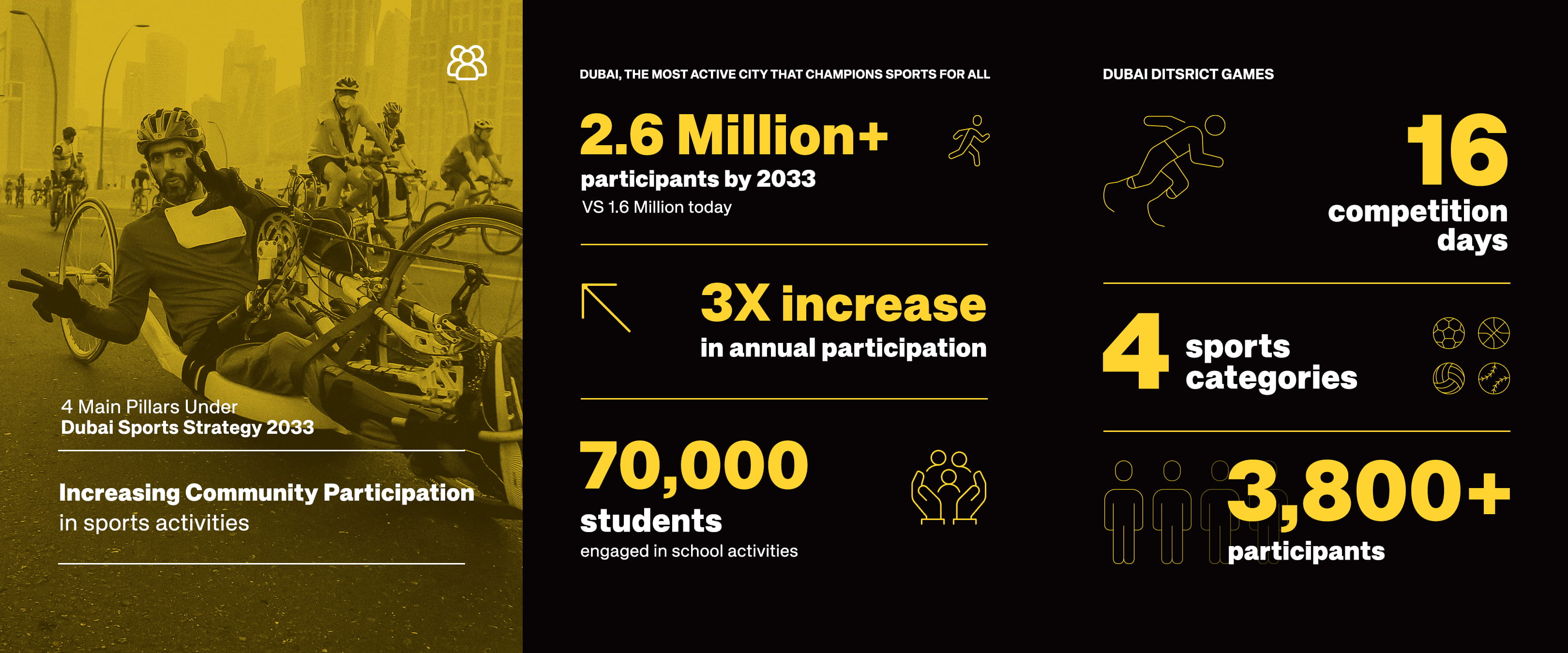 The Plan also includes establishing community youth centres offering year-round sports programmes, launching a series of annual activities for People of Determination and organising sports competitions for labour communities across 10 locations covering 12 sports.