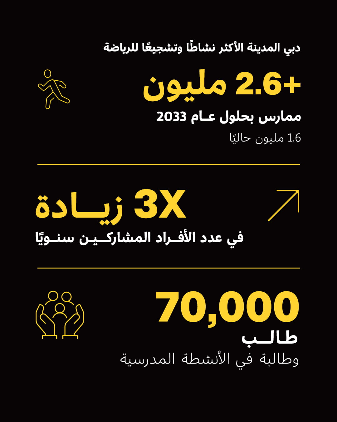 His Excellency Khalfan Jumaa Belhoul, Vice Chairman of the Dubai Sports Council, said: “This Plan aims to enhance community well-being and overall quality of life. Our goal is for Dubai to be the most active and sports-friendly city in the world, and we will work to triple the number of people actively engaged in sports in Dubai to reach 2.6 million by 2033.”