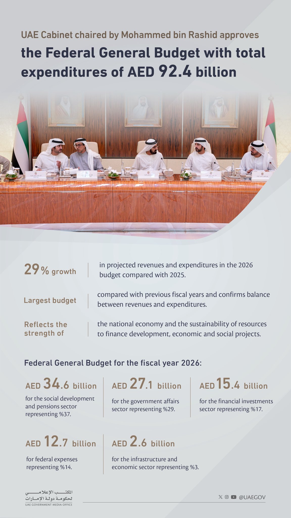 His Highness Sheikh Maktoum’s remarks came following the UAE Cabinet meeting, chaired by His Highness Sheikh Mohammed bin Rashid Al Maktoum, Vice President and Prime Minister of the UAE and Ruler of Dubai, which approved the Federal Budget Plan for the fiscal year 2026 amounting to AED 92.4 billion, a 29% increase from AED 71.5 billion in 2025.