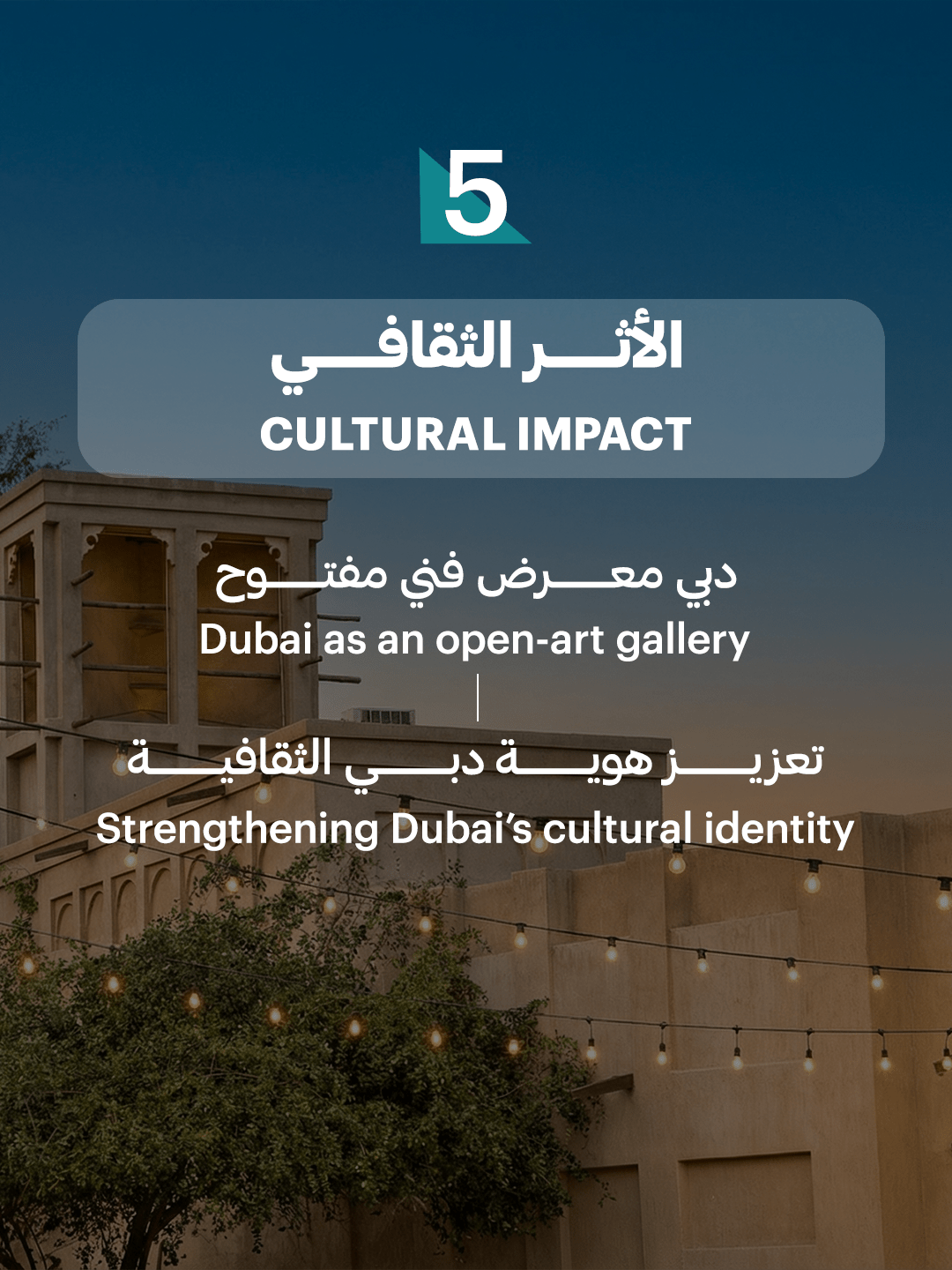 The Cultural Impact pillar turns Dubai into an open-air gallery. Working with PHI Advertising, creative works will be displayed on outdoor billboards across the emirate, bringing art into the public realm and reinforcing the city's identity.