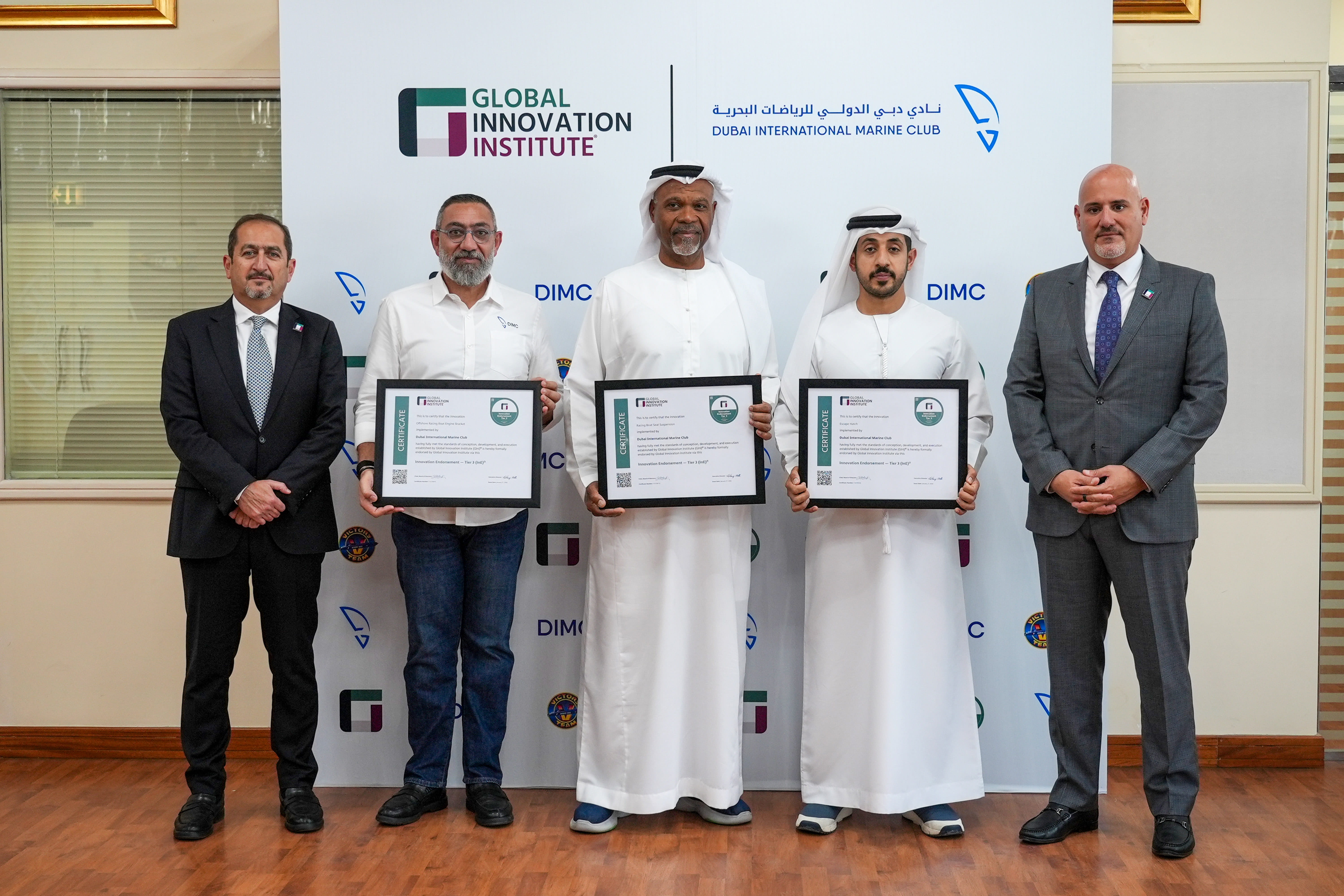 The Dubai International Marine Club (DIMC) has secured a new national milestone underscoring Dubai’s leadership in the design and manufacture of high-speed racing boats through its flagship ‘Victory’ boats. The Club was awarded three innovation accreditations from the Global Innovation Institute (GInI), recognising technical advancements in the escape hatch mechanism for high-speed boats, engine mount systems, and seat suspension systems for racing vessels.
