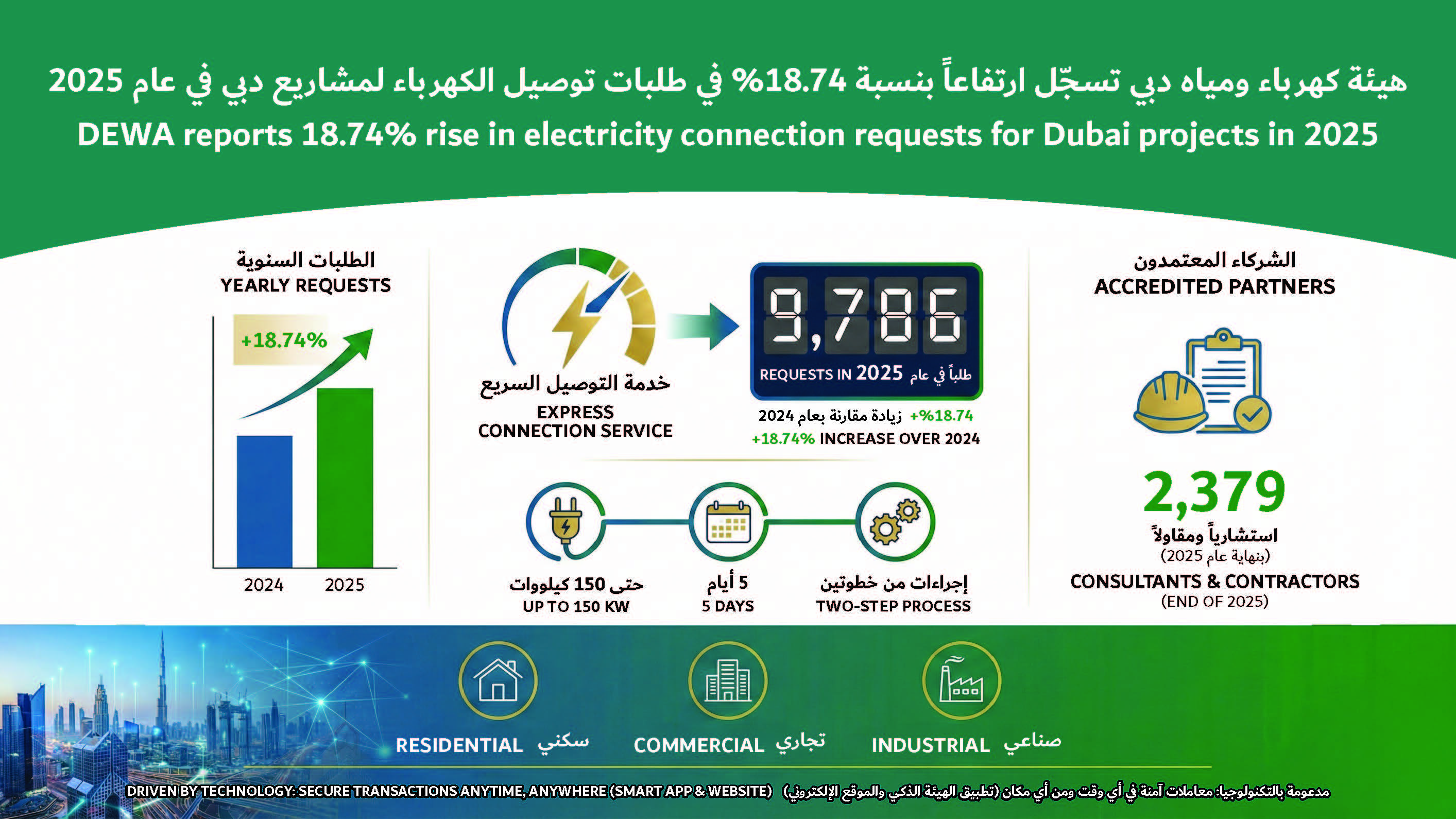 In 2025, DEWA received 9,786 electricity connection requests while the number of its accredited consultants and contractors stood at 2,379 at the end of the year.