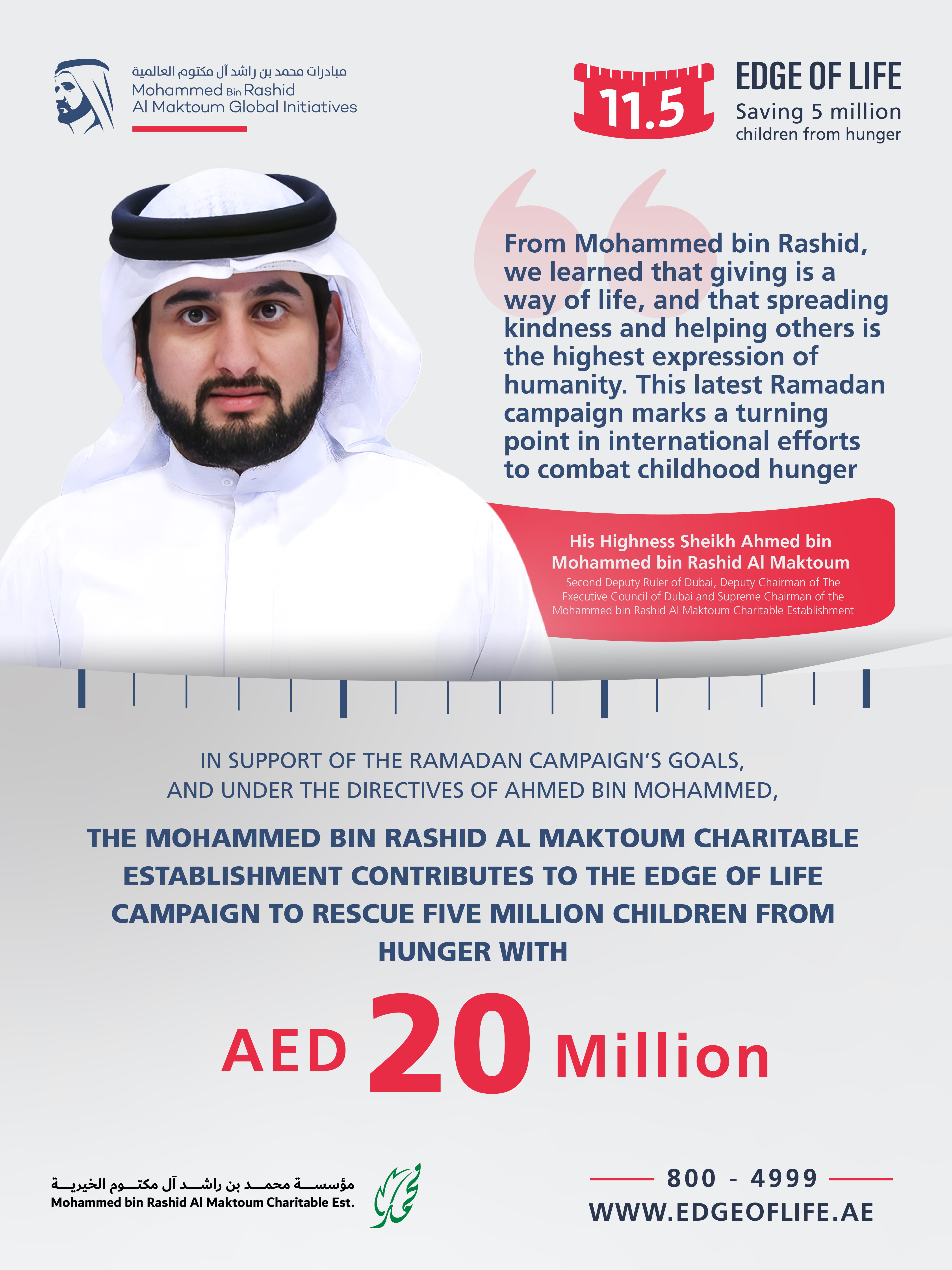Under the directives of His Highness Sheikh Ahmed bin Mohammed bin Rashid Al Maktoum, Second Deputy Ruler of Dubai, Deputy Chairman of The Executive Council of Dubai and Supreme Chairman of the Mohammed bin Rashid Al Maktoum Charitable Establishment, the Establishment has contributed AED 20 million to the Edge of Life campaign to rescue five million children from hunger.