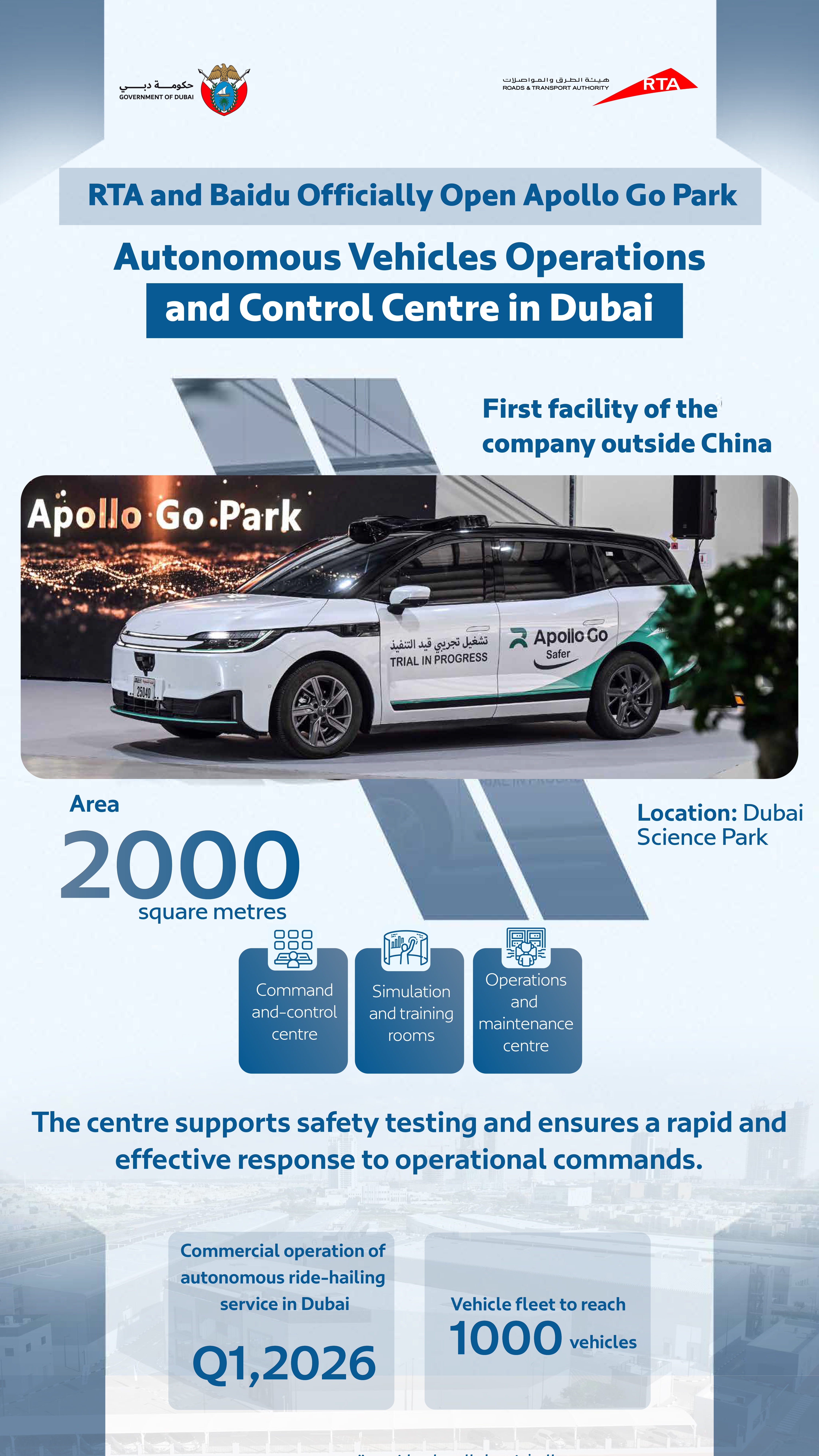 He added, “The opening of Apollo Go’s first operations centre outside China reflects the strong confidence of leading global companies in Dubai’s advanced regulatory environment and the readiness of its smart infrastructure to accommodate and advance autonomous vehicle technologies in line with the highest standards of safety and efficiency. RTA’s issuance of Dubai’s first permit for fully driverless operational trials without a safety driver represents a qualitative milestone, translating our commitment to developing a flexible and secure legislative framework that keeps pace with rapid advancements in mobility technologies, supports innovation, and fosters partnerships with leading specialised global companies in this field.